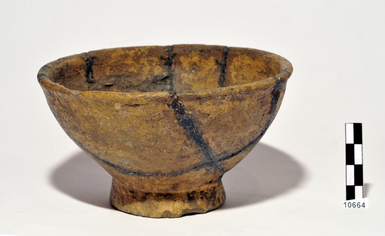 Ciotola d'impasto bruno, labbro leggermente svasato con orlo ingrossato, vasca troncoconica a profilo arrotondato, basso piede troncoconico cavo. L'esterno della vasca è ornato da tre decorazioni ramiformi incise