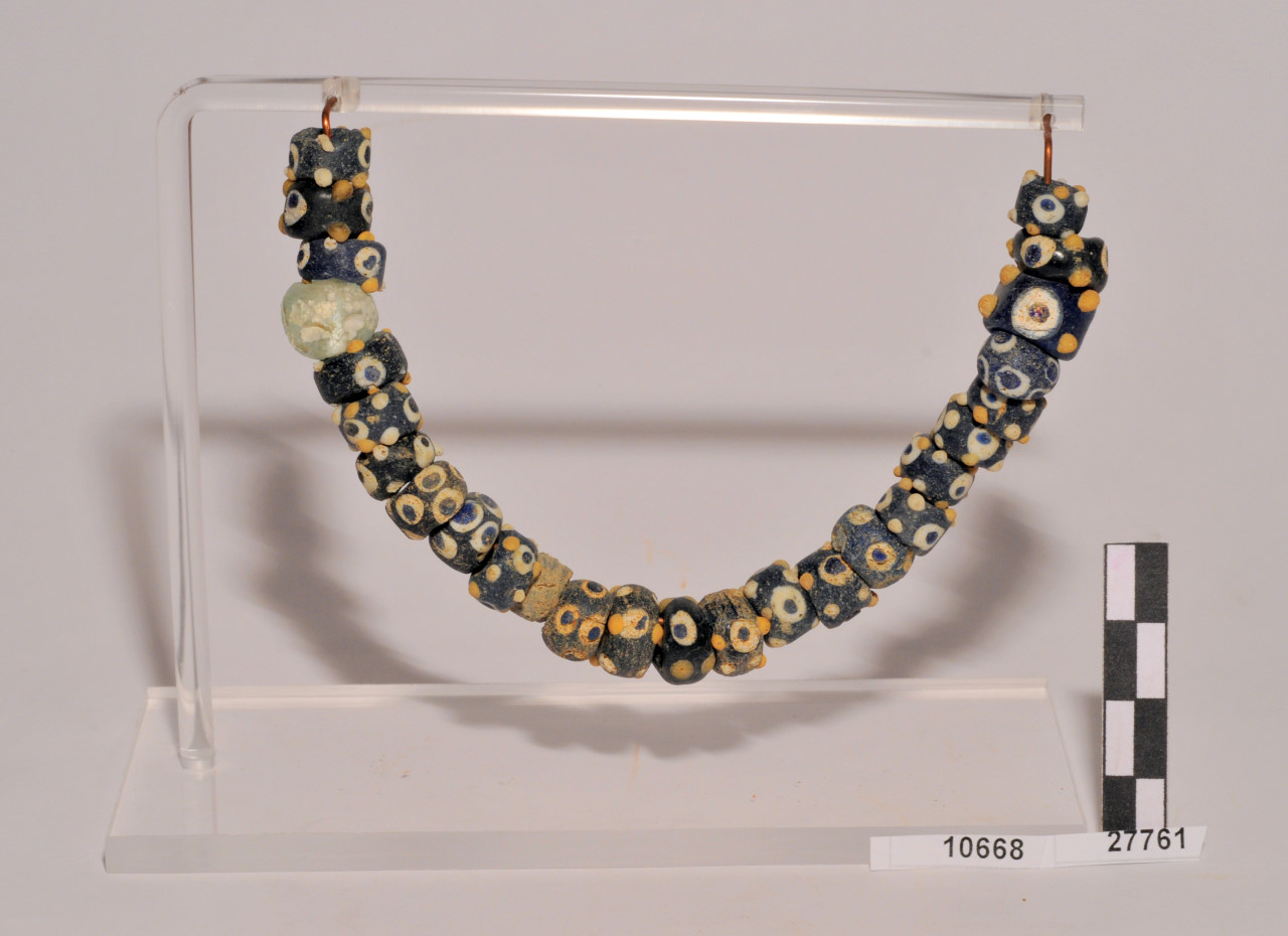 Collana costituita da vaghi cilindrici di pasta vitrea blu ad occhi bianchi e gialli. Tubercoli bianchi di argilla applicati. [Composta con inv. n. 27761]