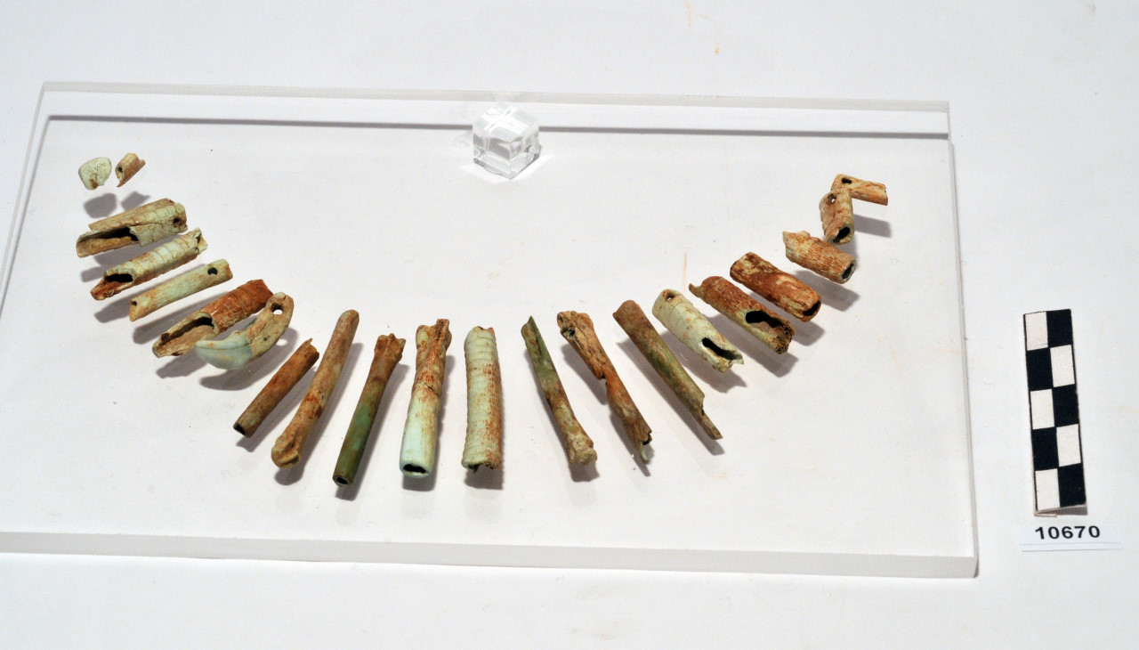 Ventuno pendagli e frammenti di collana in osso. Alcuni di essi di forma cilindrica sono ornati da linee orizzontali incise in modo da sembrare formati da anelli sovbrapposti. Foro di sospensione ad una estremità