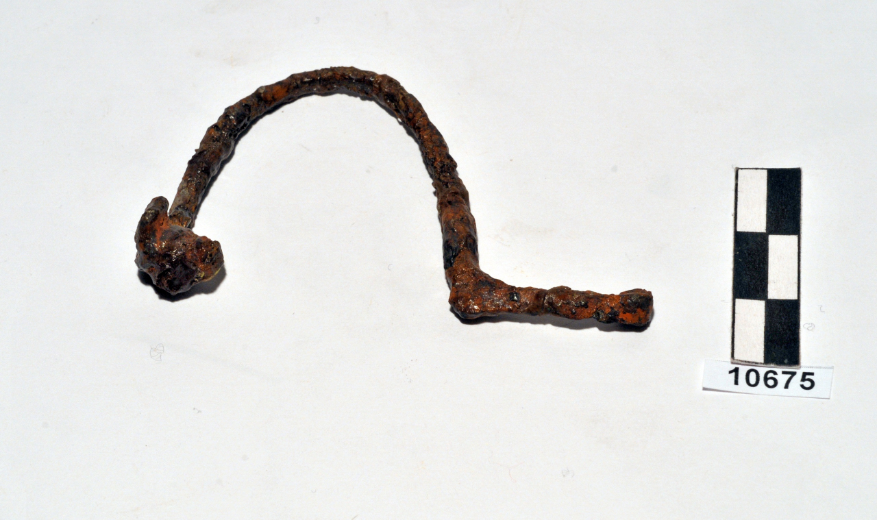 Fibula ad arco semplice a curva decentrata, lunga staffa desinente in un tubercolo o riccio (lo stato di ossidazione non permette un'identificazione certa)