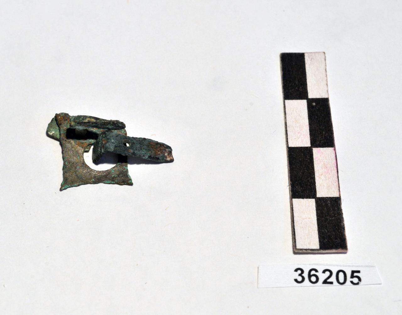 Piccola serratura quadrangolare in bronzo con angoli leggermente allungati, foro centrale e resti di aggancio