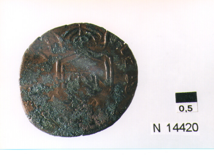 R/ scudo coronato contenente fascia iscritta; V/ tre spighe legate a un ramoscello d'olivo,