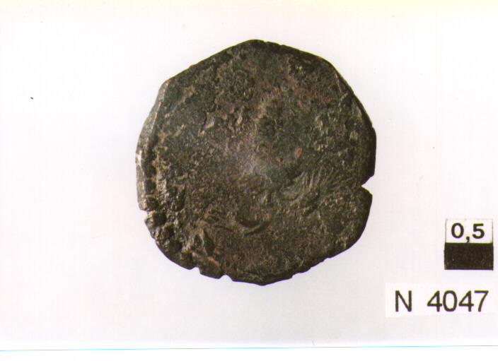 R/ scudetto accantonato da quattro rosoni e quattro fiamme che si incrociano tra loro a destra; V/ cornucopia(?),