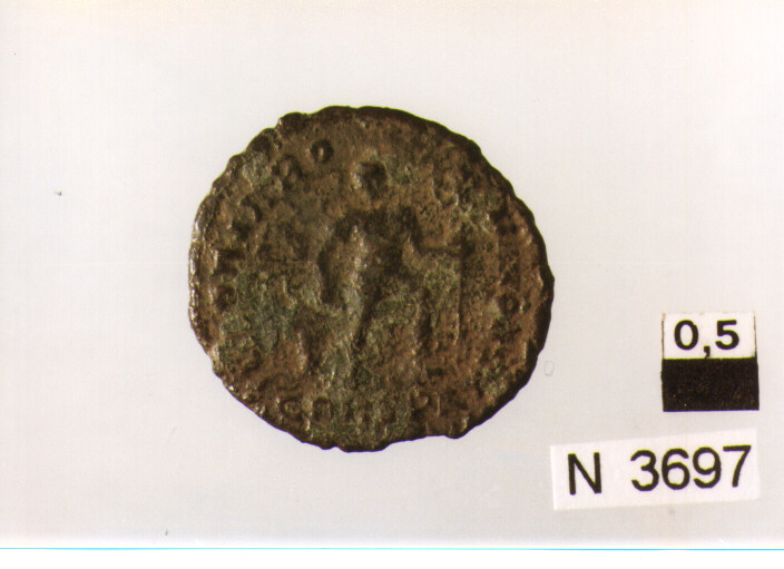 R/ busto drappeggiato, corazzato e diademato di imperatore a destra; V/ imperatore avanza verso destra con latesta volta a sinistra trascina con lamano sinistra il labaro,