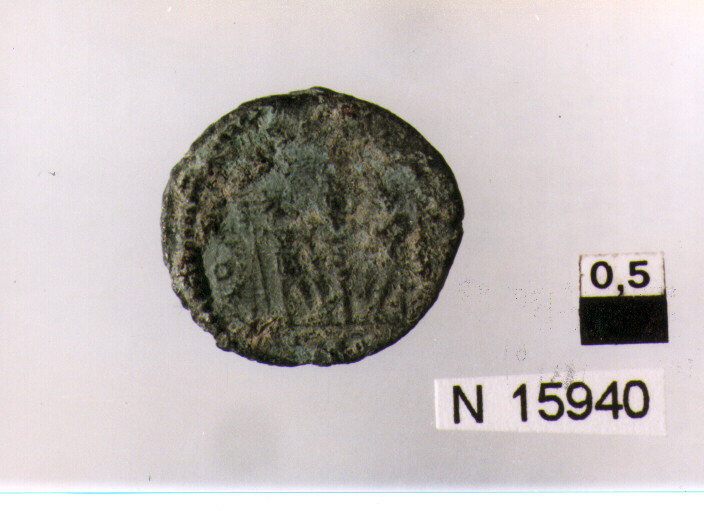 R/ busto diademato di imperatore a destra; V/ due soldati stanti rivolti l'uno verso l'altro tra uno stendardo,