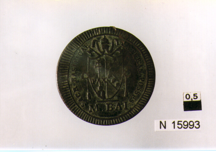 R/ iscrizione nel campo su cinque righe, sotto tre stelle; V/ stella semiovale in cornice cordonata, sovrapposto a chiavi decussate, sormontato da tiara,