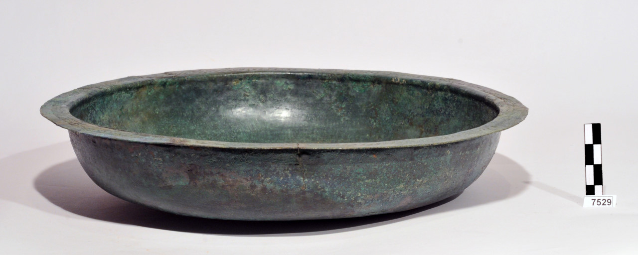Orlo a tesa orizzontale con una treccia incisa; una risega sotto l'orlo, pareti arrotondate. fondo piano