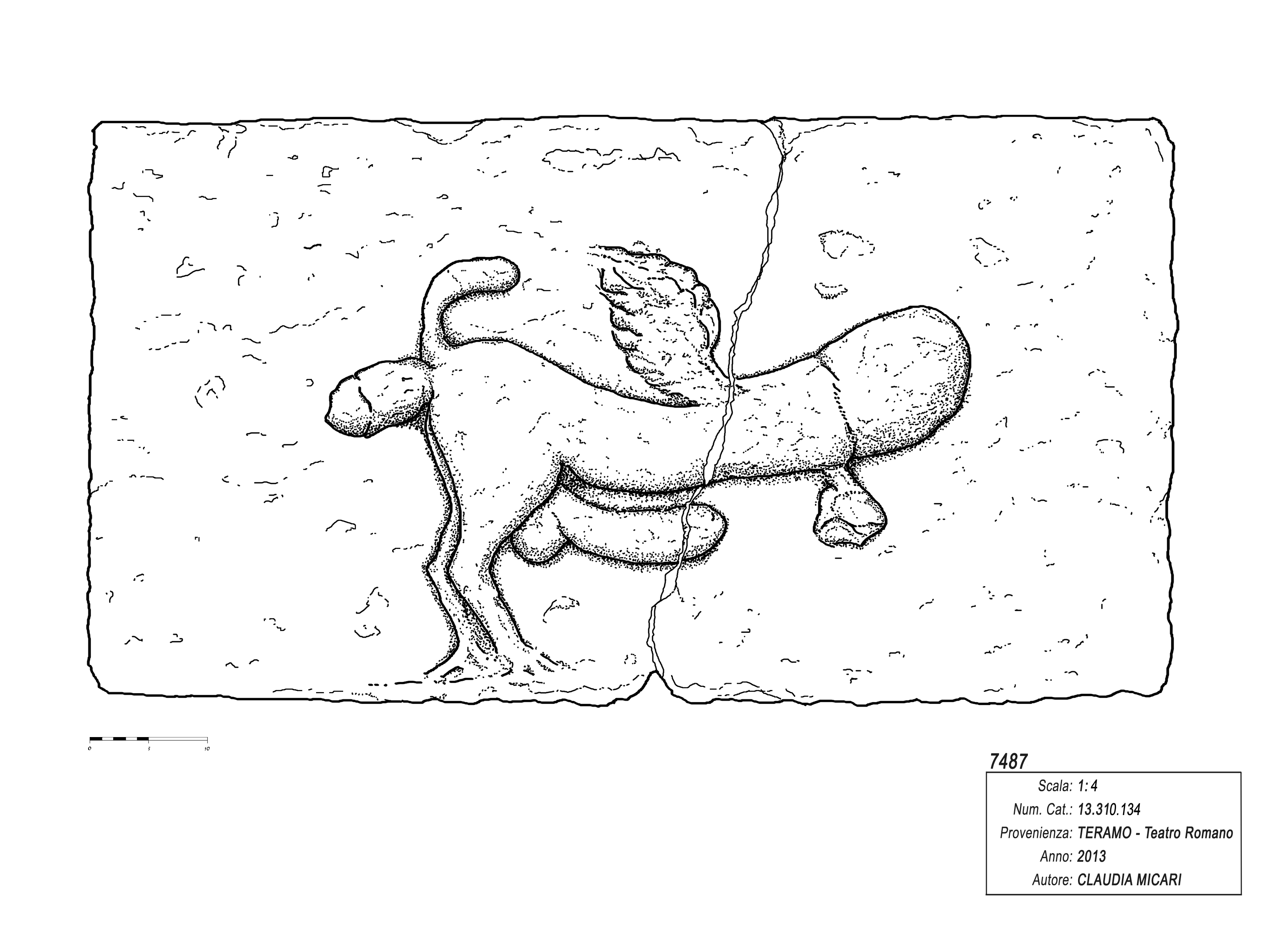 Blocco parallelepipedo, in travertino molto poroso, con bassorilievo sulla faccia principale, forse parte di piedritto di un portale o di una recinzione. La faccia principale è lavorata a gradina, e anche il rilievo presenta tracce della stessa lavorazione, poi lisciata. Le facce superiori e inferiore sono piane e lavorate a gradina, come pure quella laterale sinistra, che ha sul piano un grosso foro naturale di forma pressoché circolare. La faccia laterale destra, lavorata a gradina anch’essa, presenta un solco a sezione quadrangolare parallelo al lato corto della faccia principale, probabilmente l’incasso per una transenna o una porta di legno. La faccia posteriore, ora quasi del tutto mancante, doveva essere sbozzata con andamento pressoché parallelo alla faccia principale, cosa che fa supporre che il blocco potesse essere incassato nel muro. Misure notevoli: Lungh. fr. sx 57,3; Lungh. fr. dx 31; Lungh. tot. parte figurata 51.5; Alt.tot. parte figurata 36; Aggetto max del rilievo 3