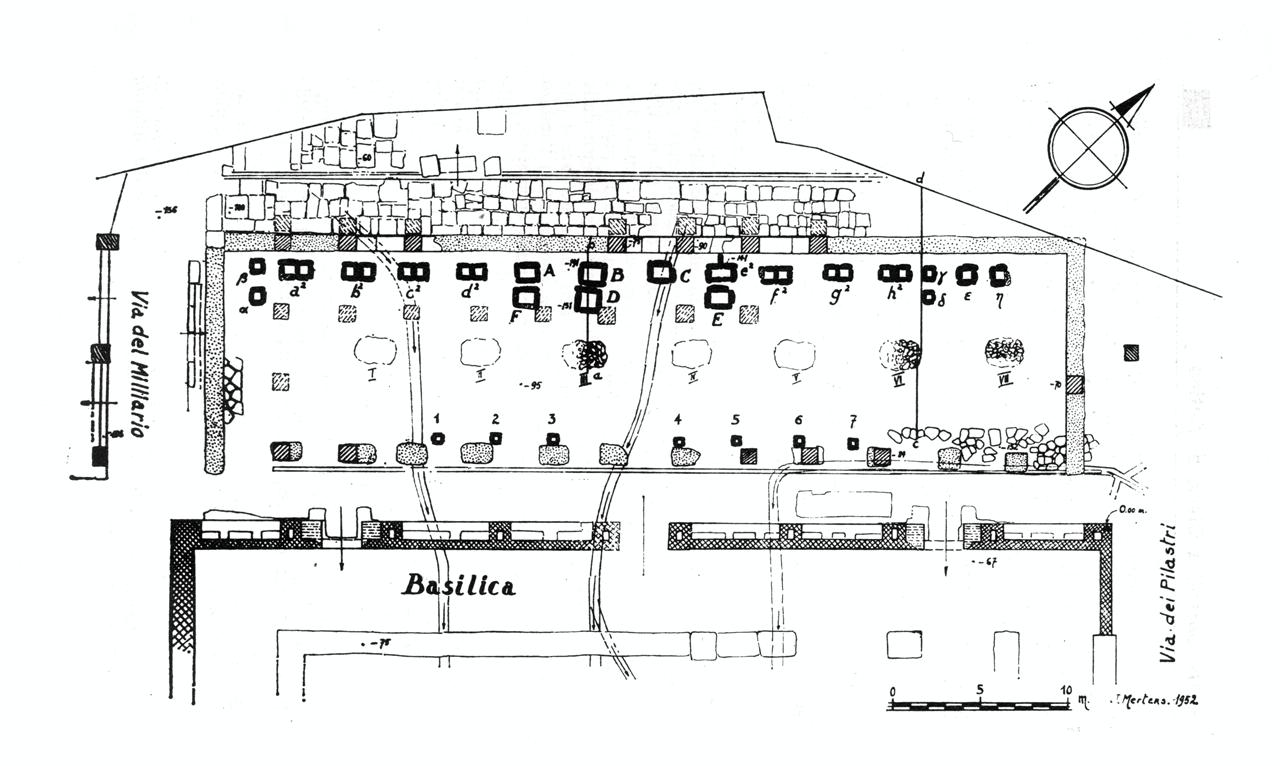 La basilica occupa l'intera larghezza dell'isolato tra i due decumani (53,10 x 23,35 m) e rivolge al foro uno dei lati lunghi. La facciata settentrionale presentava tre ingressi, mentre lo spazio interno era suddiviso in navate da un colonnato esteso sui quattro lati. Saggi in profondità hanno rivelato la presenza di costruzioni più antiche. La costruzione della basilica è attribuibile agli anni di passaggio tra il II e il I secolo a.C. Successivamente, negli anni centrali del I secolo a. C. furono aggiunti gli ingressi laterali e il muro di facciata fu raddoppiato