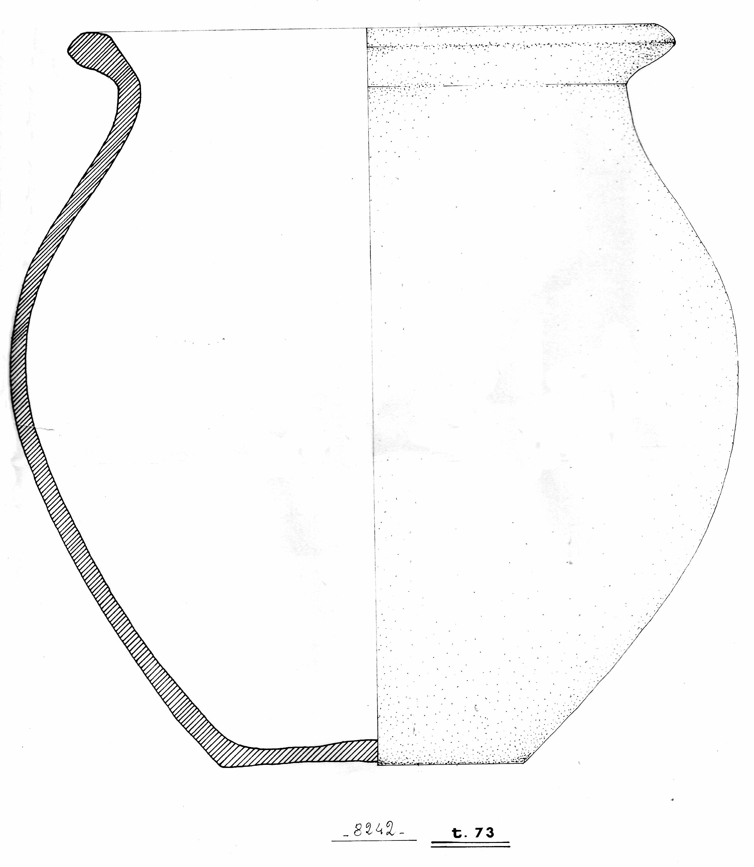 Orlo estroflesso leggermente ingrossato e appiattito con spigolo superiore ed esterno, distinto inferiormente da solcatura; corpo globulare espanso in alto; fondo piatto