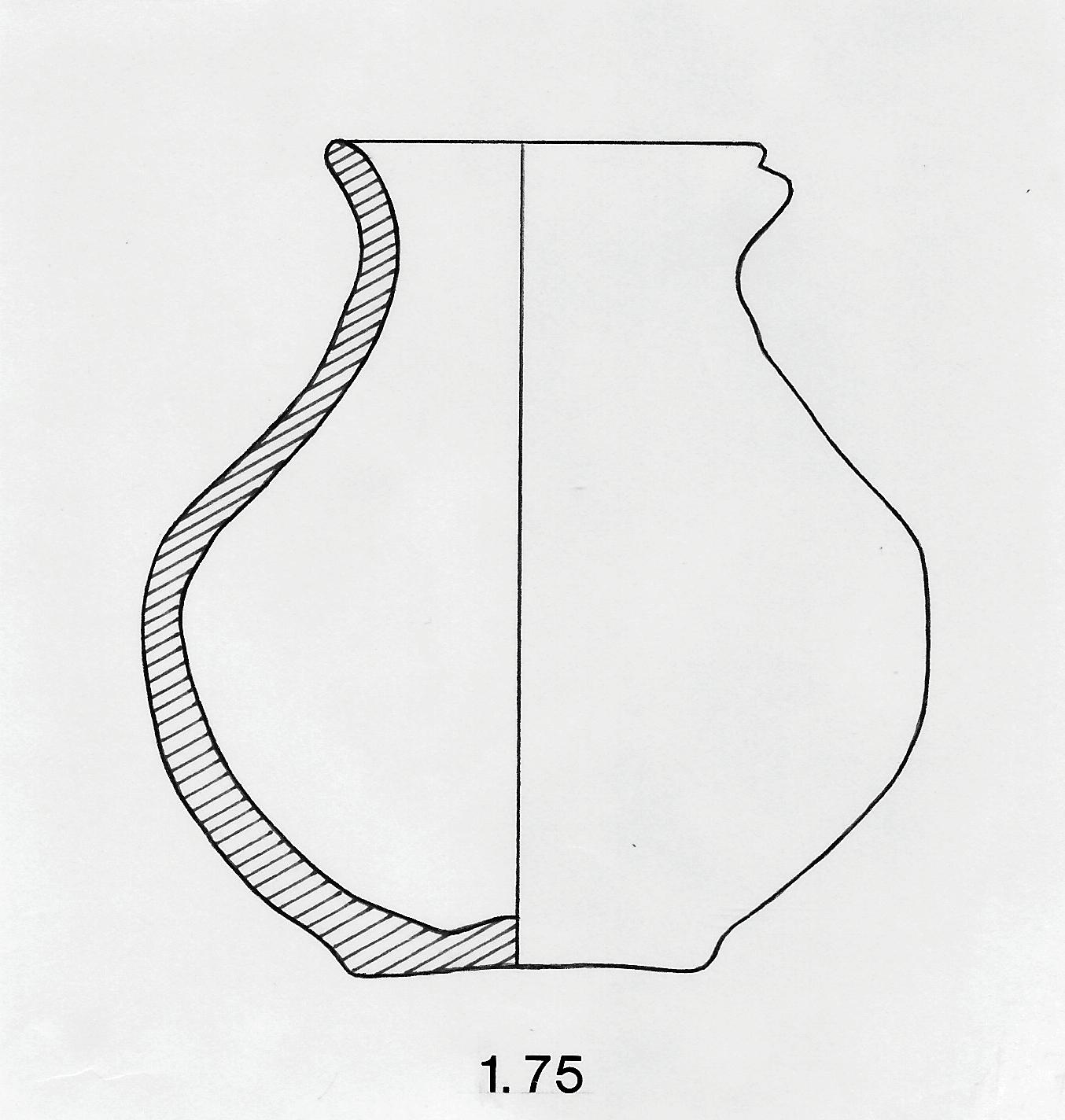 Orlo svasato con spigolo esterno; breve collo, corpo biconico, piccolo fondo piatto. Ansa a nastro verticale impostata sul collo