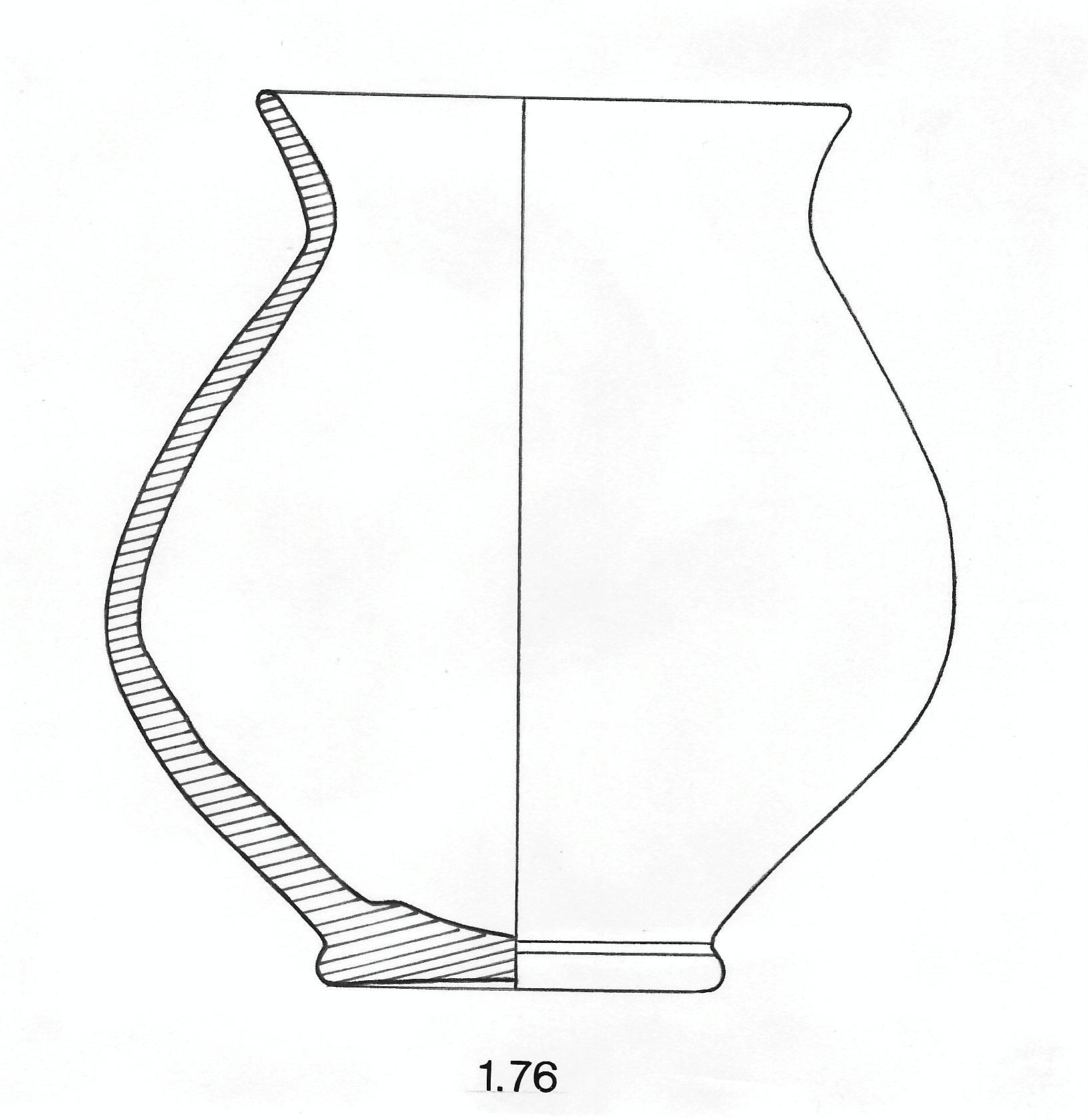 Orlo poco svasato con margini arrotondati; corpo irregolare tendente al biconico, basso piede, fondo piatto