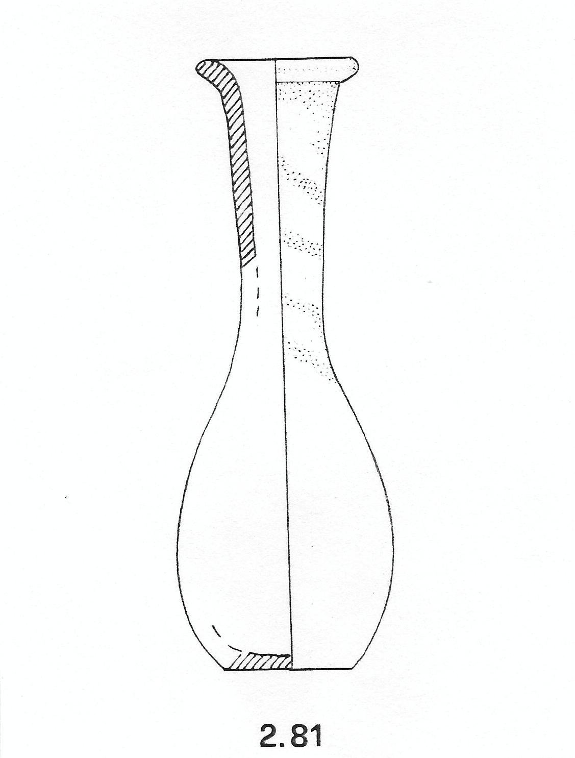 Orlo svasato con margini arrotondati, distinto; lungo collo cilindrico che si amplia leggermente verso l'orlo e corpo ovoide allungato; fondo piatto