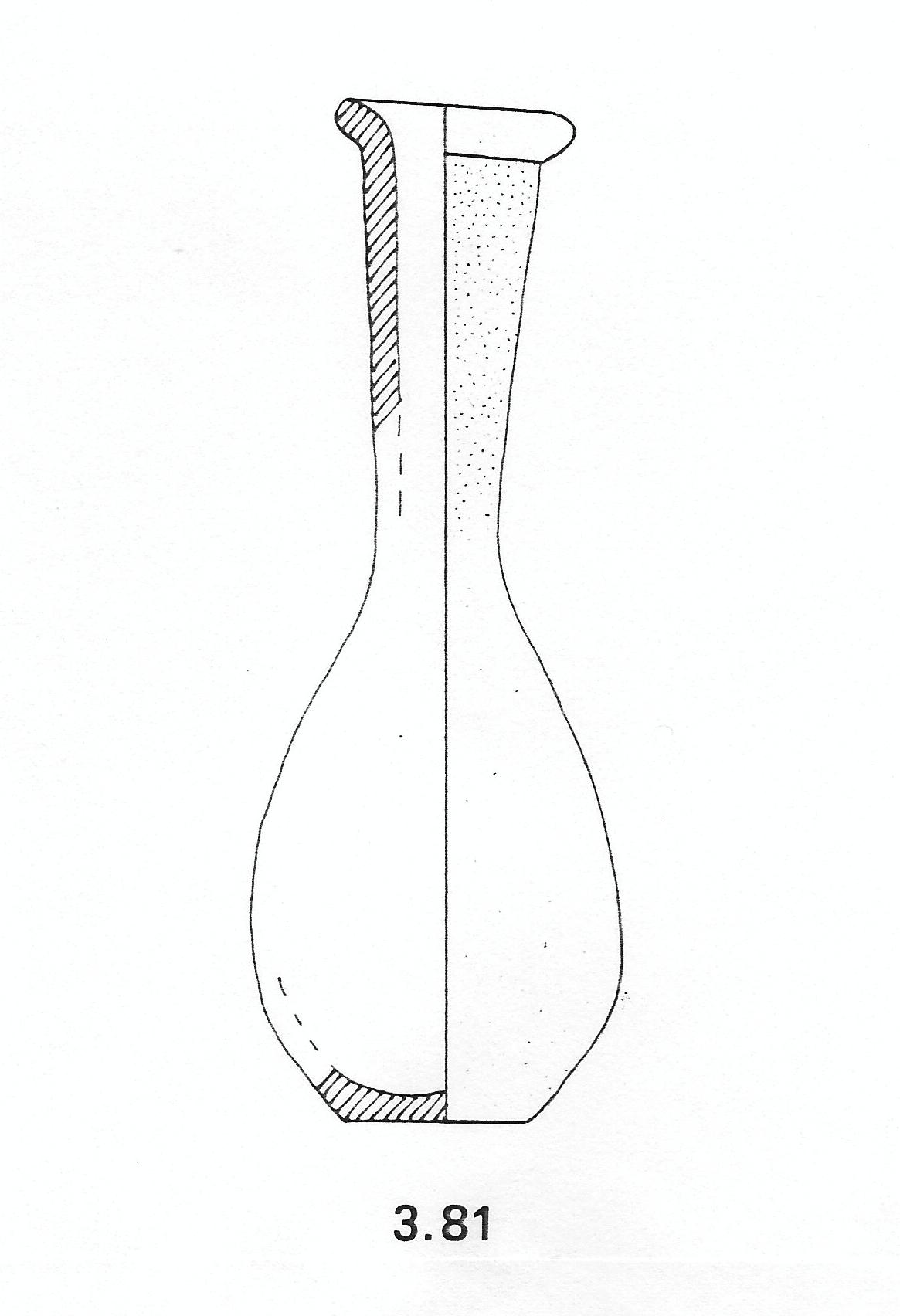 Orlo svasato e ingrossato con margini arrotondati; lungo collo cilindrico che si amplia leggermente verso l'orlo e corpo ovoide; fondo piatto
