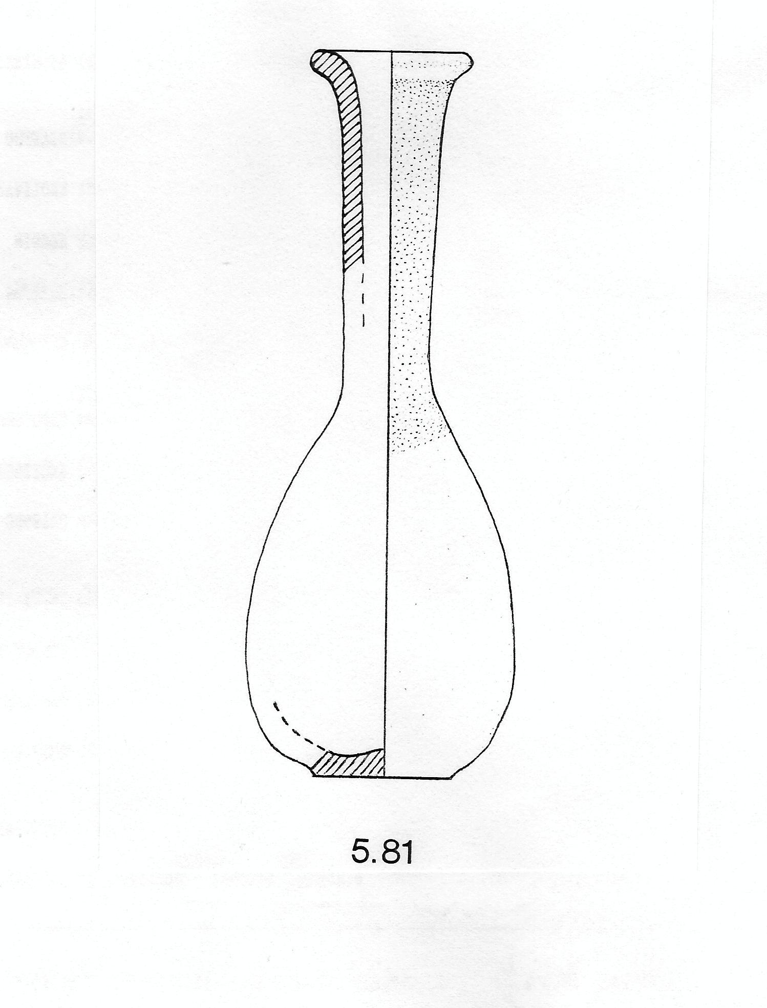 Orlo svasato con margini arrotondati; lungo collo cilindrico che si amplia leggermente verso l'orlo e corpo allungato; fondo piatto