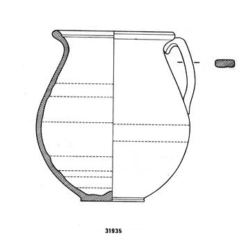 Orlo svasato ingrossato e arrotondato; solcatura interna sotto l'orlo; corpo globulare espanso in basso; fondo piatto distinto. Ansa a nastro impostata sotto l'orlo