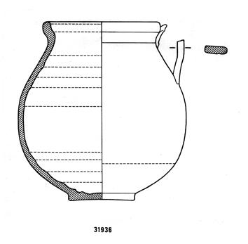 Orlo ingrossato e arrotondato con battente, breve collo indistinto, corpo piriforme espanso in basso, piede verticale, fondo piatto. Ansa a nastro verticale impostata sull'orlo