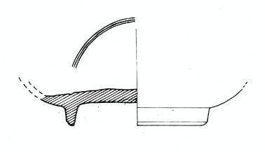 Fondo con piede a faccia interna obliqua e esterna verticale, concavo- convessa, con spigolo verso l'appoggio. Fondo interno con solcatura e altre piu' sottili sul fondo esterno verso il piede