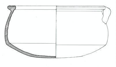 Orlo a tesa, ingrossato all'interno, vasca con parete poco convessa rientrante verso l'orlo e fondo convesso. Ansa a maniglia verticale asimmetrica