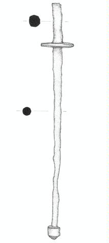 Stelo cilindrico a sezione circolare, che va rastremandosi verso l'estremità; impugnatura cilindrica, distinta dallo stelo tramite piastra a disco circolare. Fodero attaccato (?)