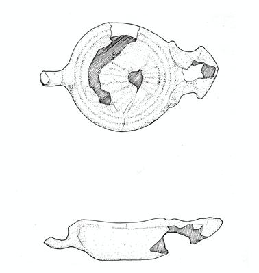 Disco circolare decorato da conchiglia, con due solcature ai margini e cornice esterna; becco triangolare con volute esterne al profilo della lucerna. Ansa ad anello sormontante
