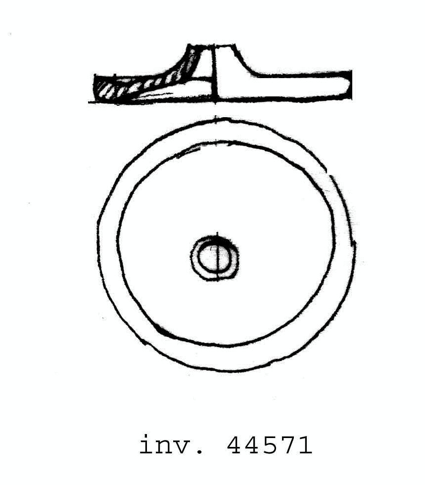 - NOTIZIE STORICO CRITICHE Pertinente a un calice realizzato in vetro soffiato con la tecnica a un tempo, come testimoniato dal piede forato (lo stelo era evidentemente cavo). Dischetti forati utilizzati come pendente sono attestati raramente e in tombe femminili. In questa tomba è evidentemente un ex-voto. Dischetti forati utilizzati a mo' di pendente nelle tombe femminili sono a Cividale del Friuli (MENIS 1990) e a Nocera Umbra, località Il Portone (L'oro degli Avari)
