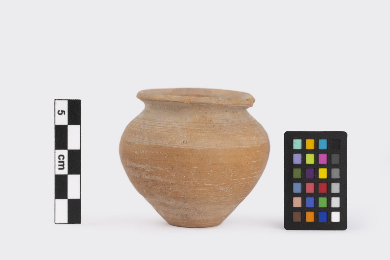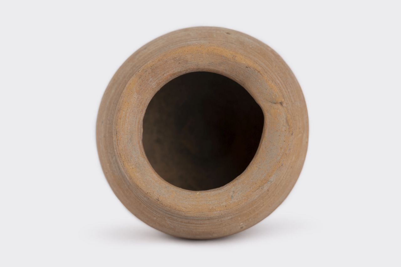 Orlo distinto, collo breve, corpo globulare, fondo piatto, profilato. Linee di tornio interne ed esterne sulla parte inferiore del ventre. Superficie esterna lisciata.Di piccole dimensioni