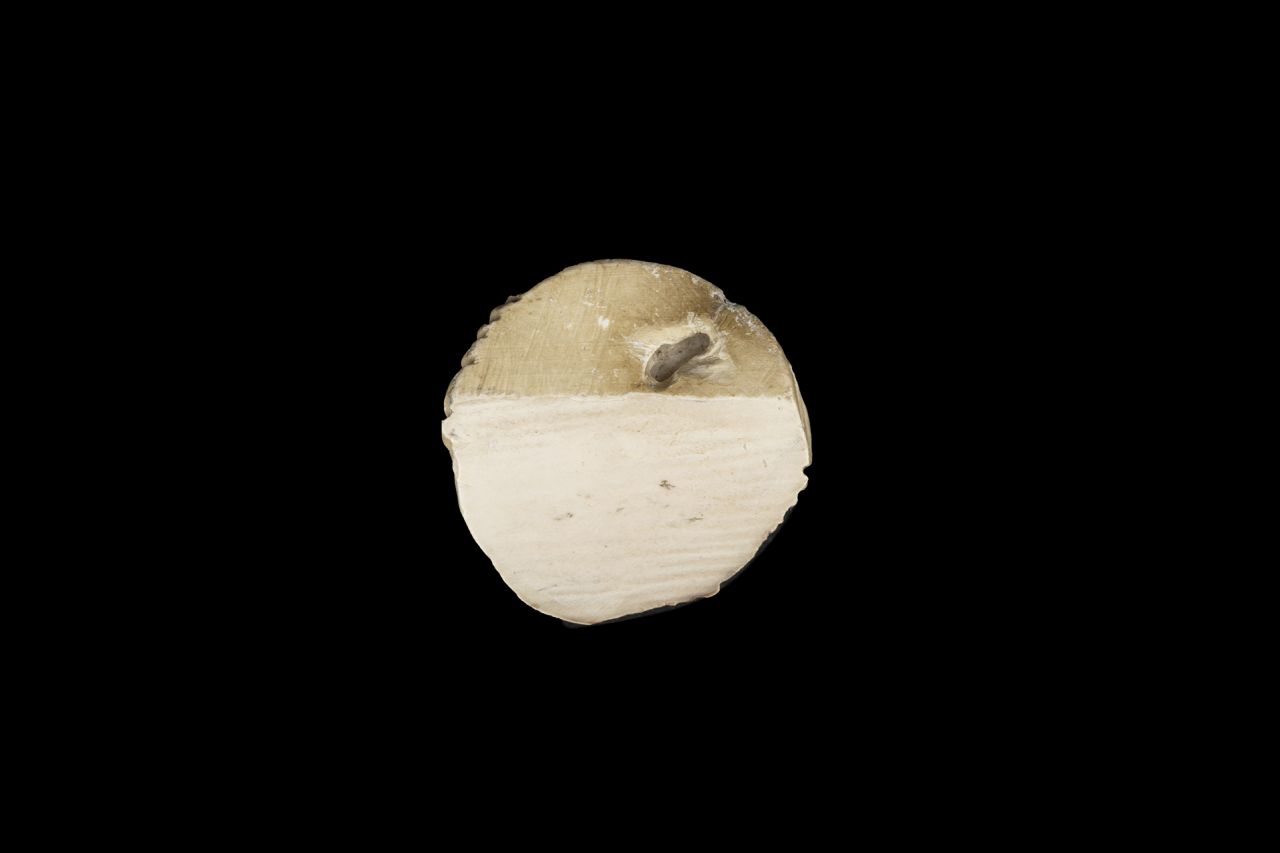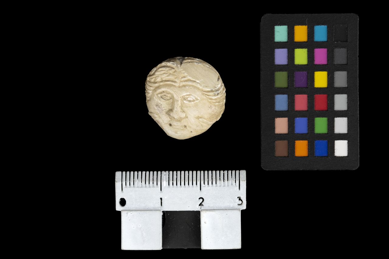 Ciondolo in osso lavorato di colore bianco. Una faccia decorata; retro liscio. Foro passante sulla sommità della testa