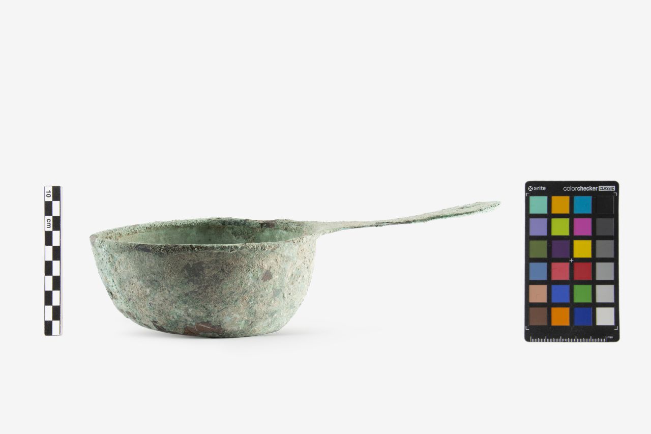 Orlo arrotondato, labbro breve, ripiegato all'interno, vasca profonda a pareti tese, fondo piano, apode all’esterno e lievemente convesso all’interno. Manico orizzontale, lievemente inclinato verso il basso, a profilo concavo, che termina a disco con foro centrale semicircolare