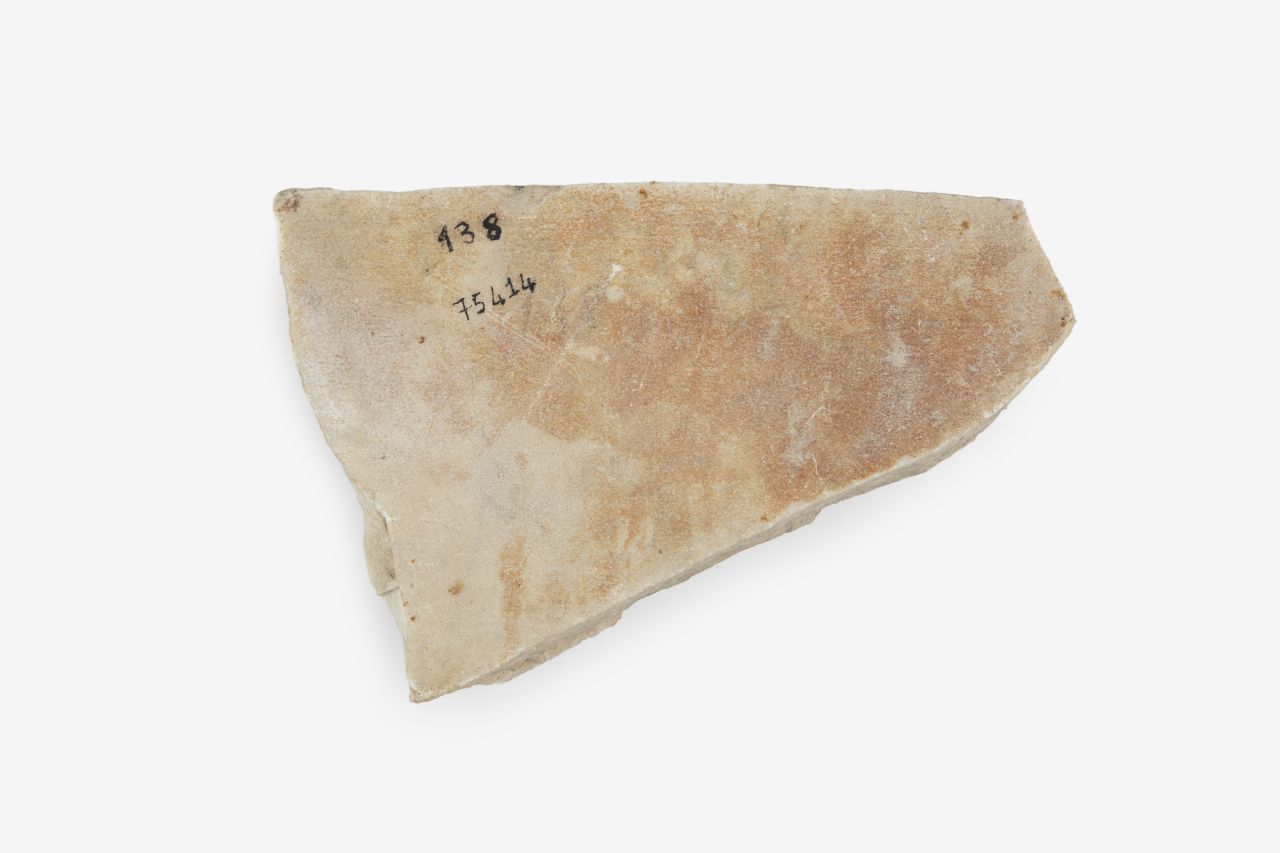 Frammento di lastra di marmo bianco con alcune lettere incise. Il testo dell'iscrizione doveva essere disposto su almeno tre righe a giudicare dai resti delle lettere. Nella parte sinistra, la lastra sembra avere un margine rialzato, forse traccia della cornice originaria