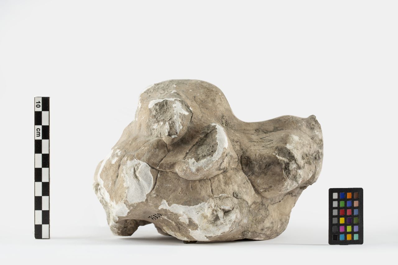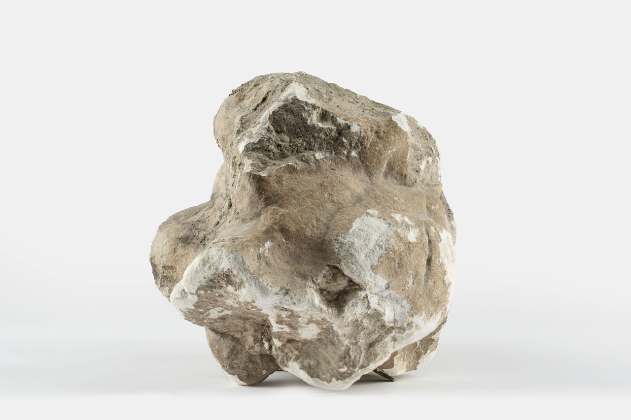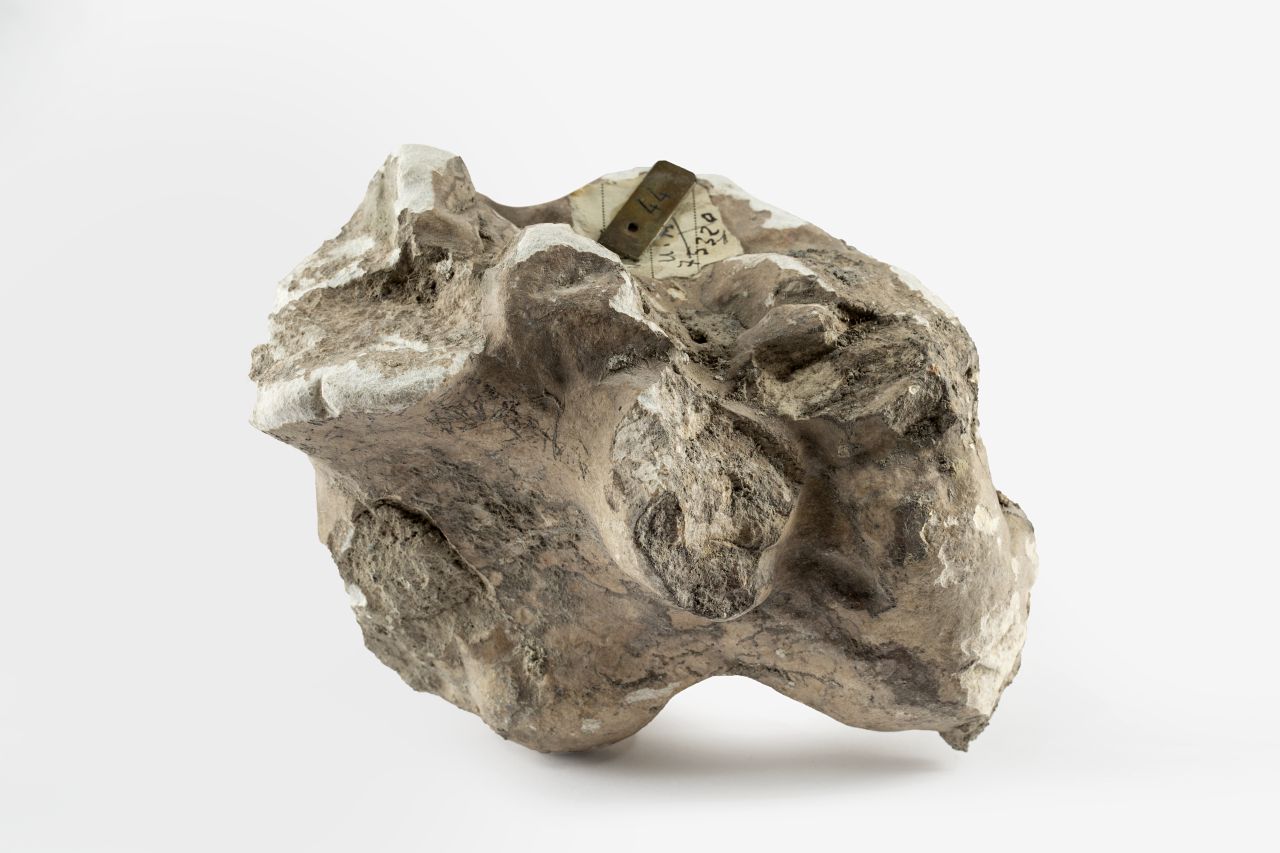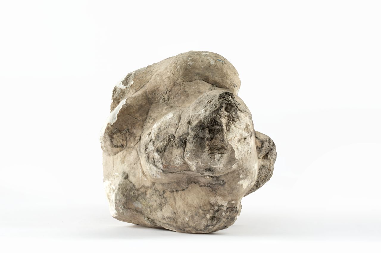 Elemento decorativo scolpito in pietra calcarea il cui cattivo stato di conservazione non consente una chiara identificazione. Sulla superficie del reperto, nell'insieme informe, si osservano incisioni di forma semicircolare con solcatura mediana. Esso è stato certamente trattato per essere parte di un complesso più ampio, forse con funzione di applique, o come elemento di un gruppo scultoreo o di una decorazione architettonica