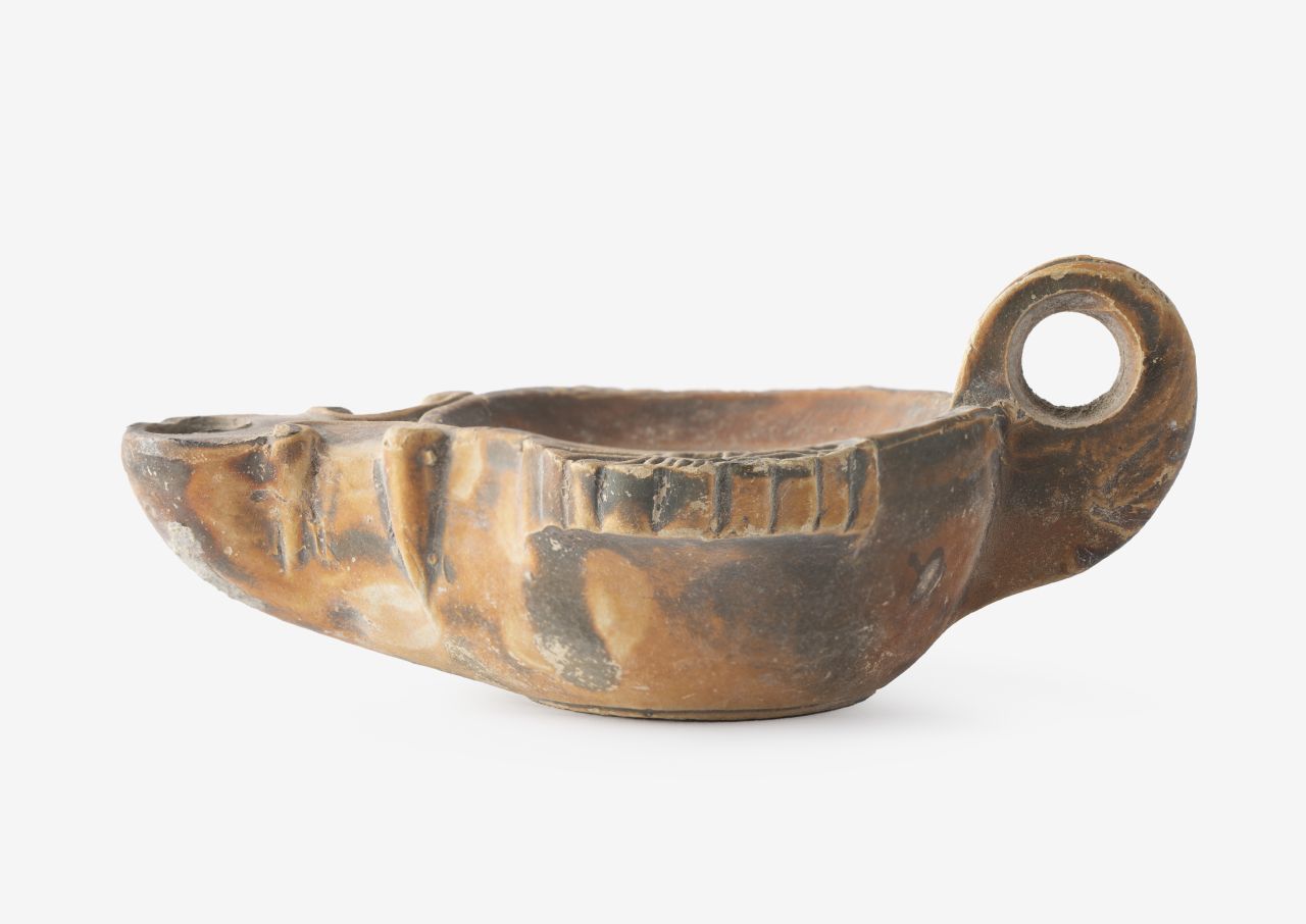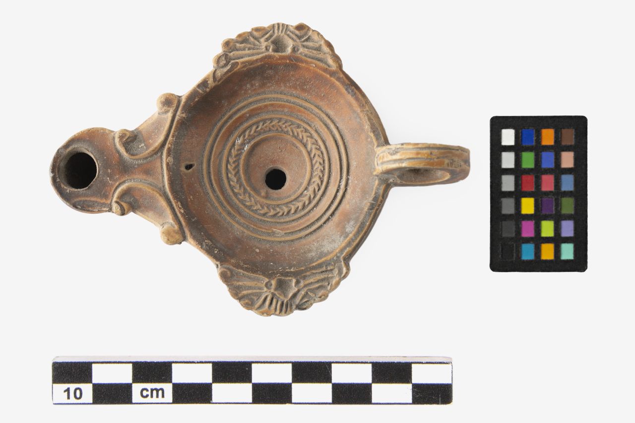 - NOTIZIE STORICO CRITICHE Le lucerne a volute sporgenti dal disco, che presentano due alettelaterali, sono vicine a modelli ellenistici e sono state variamente datate a partire dalla prima o dalla seconda metà del I sec. d.C. fino alla fine del secolo
