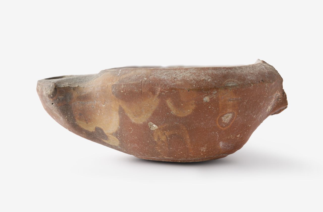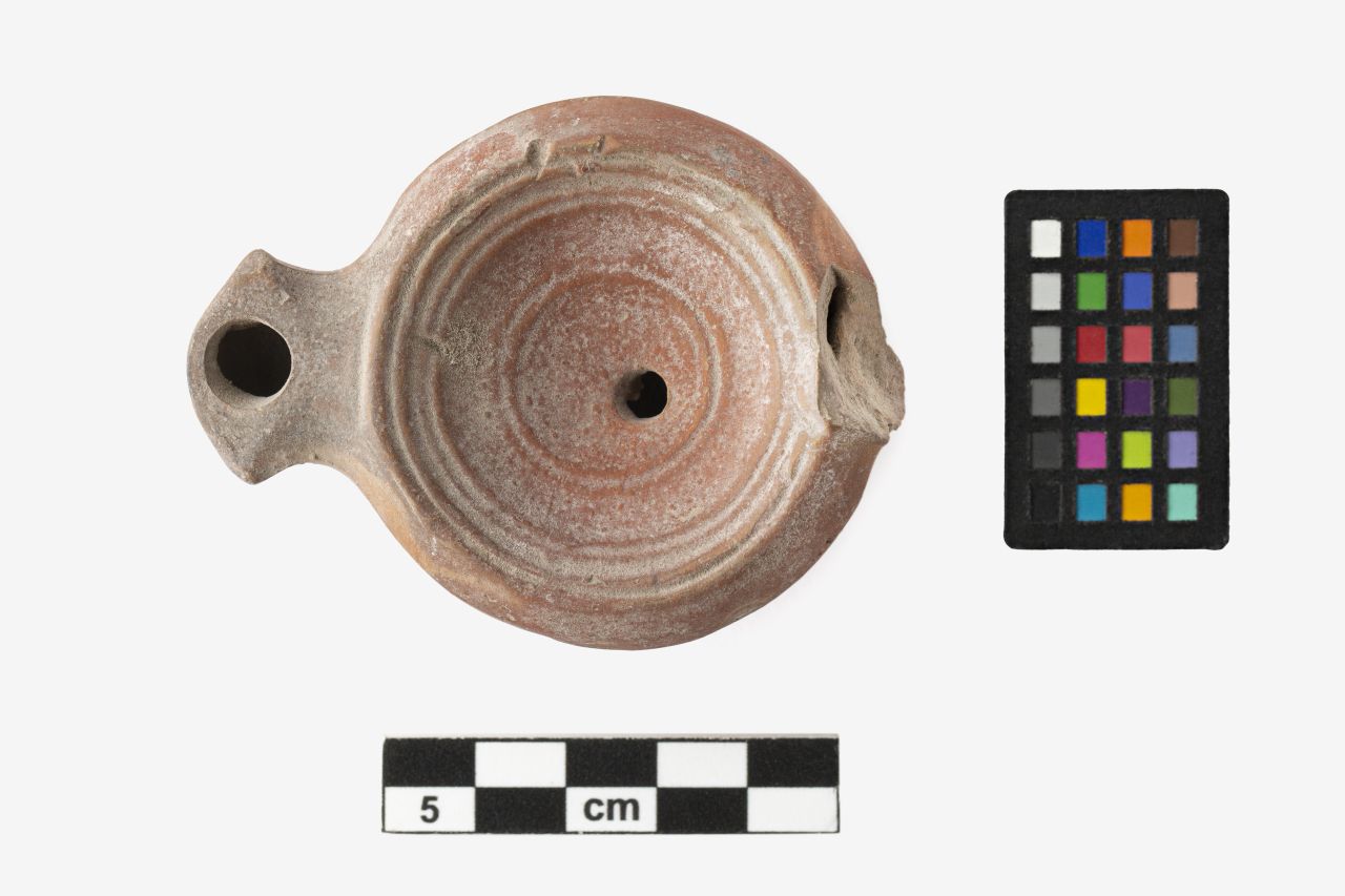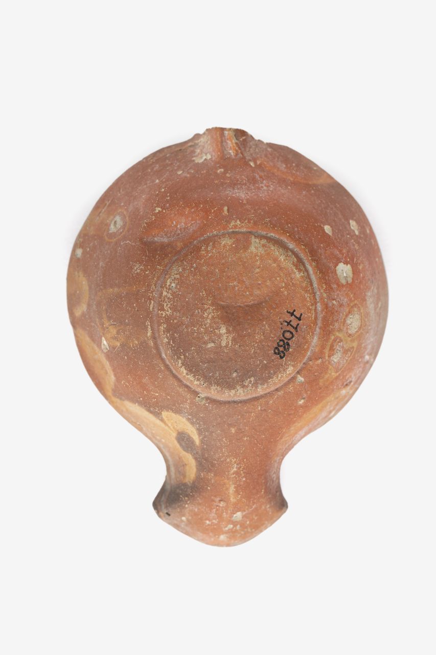 - NOTIZIE STORICO CRITICHE Il tipo costituisce una variante delle lucerne a volute con becco angolato, che hanno conosciuto una vasta diffusione in tutto l'impero romano. Questa variante, poco attestata, che mantiene il becco triangolare ma non possiede le volute di raccordo con la spalla, è databile al secondo quarto del I secolo d.C