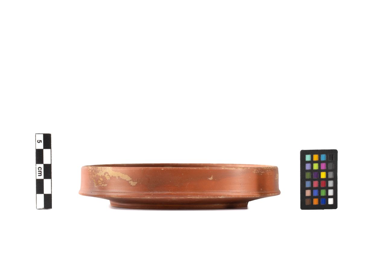 Orlo a fascia piatto, pareti verticali e lisce, listello di giunzione tra la carena e il fondo. Piede basso ad anello, molto sottile. Vernice di colore arancione, opaca. Assenza di bollo
