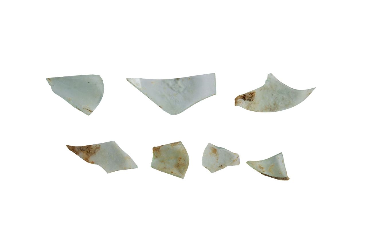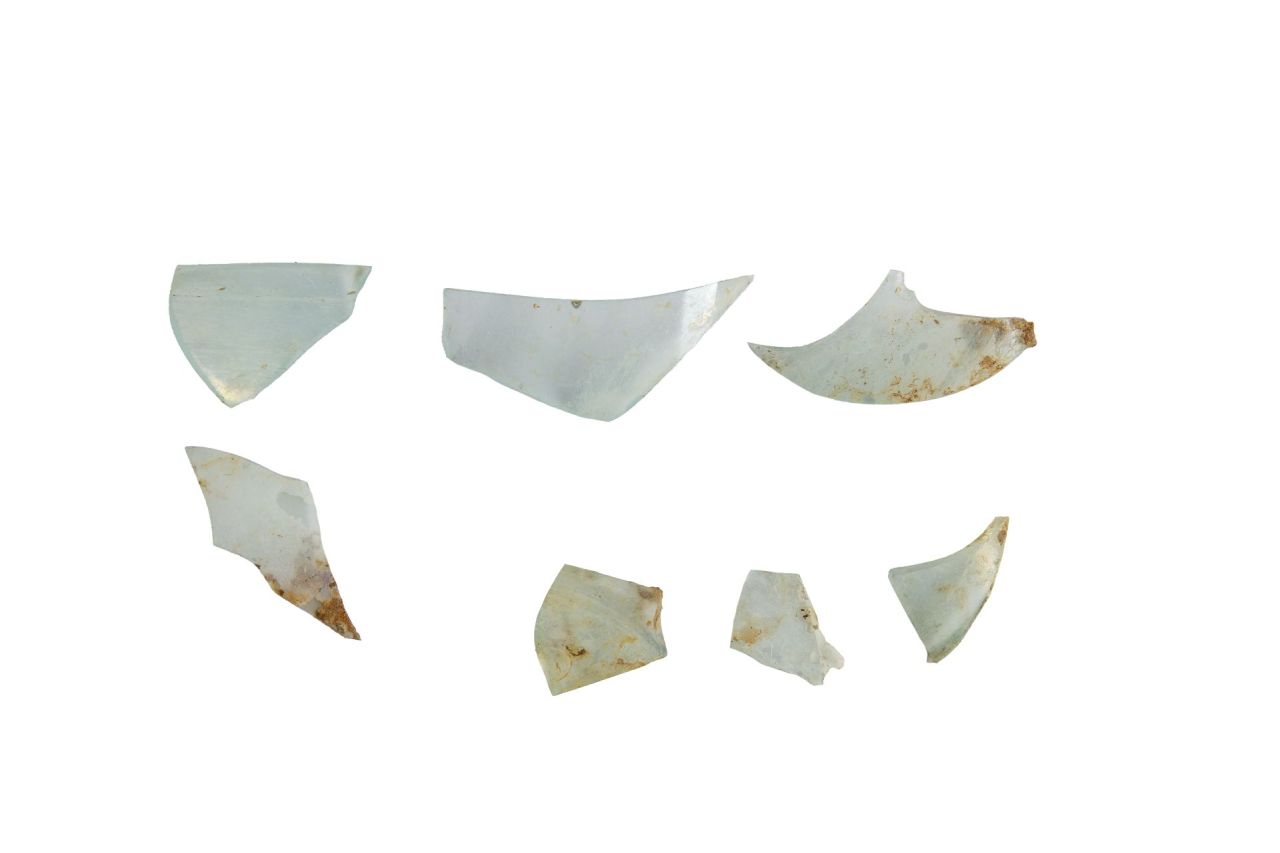 Frammenti pertinenti probabilmente a forme chiuse (almeno 3 esemplari differenti) in vetro trasparente con sfumature azzurre. Vetro molto depurato
