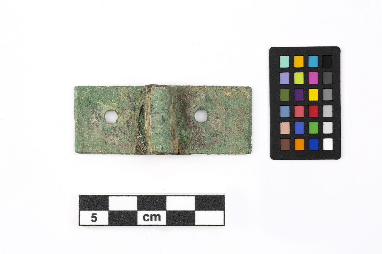 Placche rettangolari con nervatura centrale formata da 5 anellini cilindrici, muniti di foro passante in cui si conserva ancora una traccia del filo di ferro. Un fori passanti sulle placche per l'alloggio dei chiodini di aggancio allineati ai lati della nervatura centrale. Di piccole dimensioni