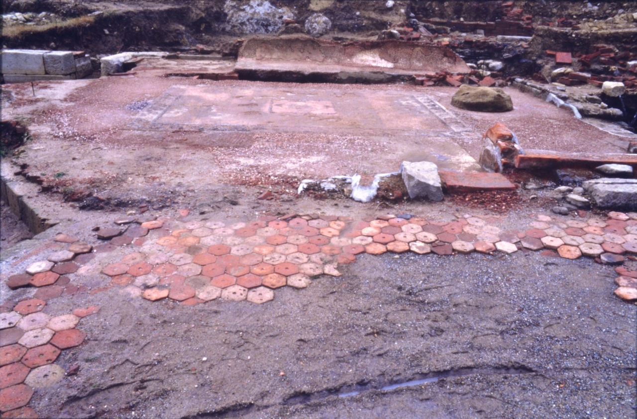 Edificio termale, ubicato lungo la sponda sud-orientale del fiume Hyele, caratterizzato da un impianto planimetrico a "circuito chiuso". Dell'edificio rimangono cospicui resti del settore centrale, costituito dagli ambienti termali propriamente detti (apoditerio, calidario), e del settore meridionale con funzione di servizio. A nord si trova il vano A, con pavimentazione ad esagonette, interpretato come apoditerio, attraverso il quale si accede al calidario D. Questo presenta una pianta rettangolare di m 8x5.40 con pavimentazione in signino decorato ed una vasca a schienale lungo il lato sud-est, posta sopra ad un ipocausto. Nel settore nord-orientale del vano si conserva parte di un sostegno circolare in arenaria relativo ad un "louterion". All'interno del vano sono stati rinvenuti un banco, a nord, ed una fontana per l'acqua fredda a nord-ovest. Ad est dell'apoditerio si trova il vano B, di pianta all'incirca quadrata, dotato di vasche in terracotta con schienale rettilineo. L'accesso al praefurnium, posto ad una quota più bassa, è garantito dal corridoio E. L'ipocausto, ancora visibile, è in mattoni eleati (cm 34x34). L'edificio è composto da altri due ambienti aggiuntivi: il vano C e il vano F. Il vano C, di incerta funzione, è attiguo al vano B ed è delimitato a sud-ovest e a nord-est da muri in tecnica "a scacchiera". Il vano F, ubicato nella parte orientale dell'edificio, presenta una fodera interna in mattoni ed una pavimentazione in cocciopesto che consentono di identificarlo con una cisterna. Le strutture murarie superstiti sono in blocchi squadrati di arenaria alternati a blocchetti di dimensioni più piccole, allettati con malta, e posti su filari sovrapposti in maniera sfalsata con effetto "a scacchiera". Vengono, inoltre, impiegati mattoni eleati utilizzati anche per l'ipocausto, come preparazione pavimentale o rivestimento pavimentale