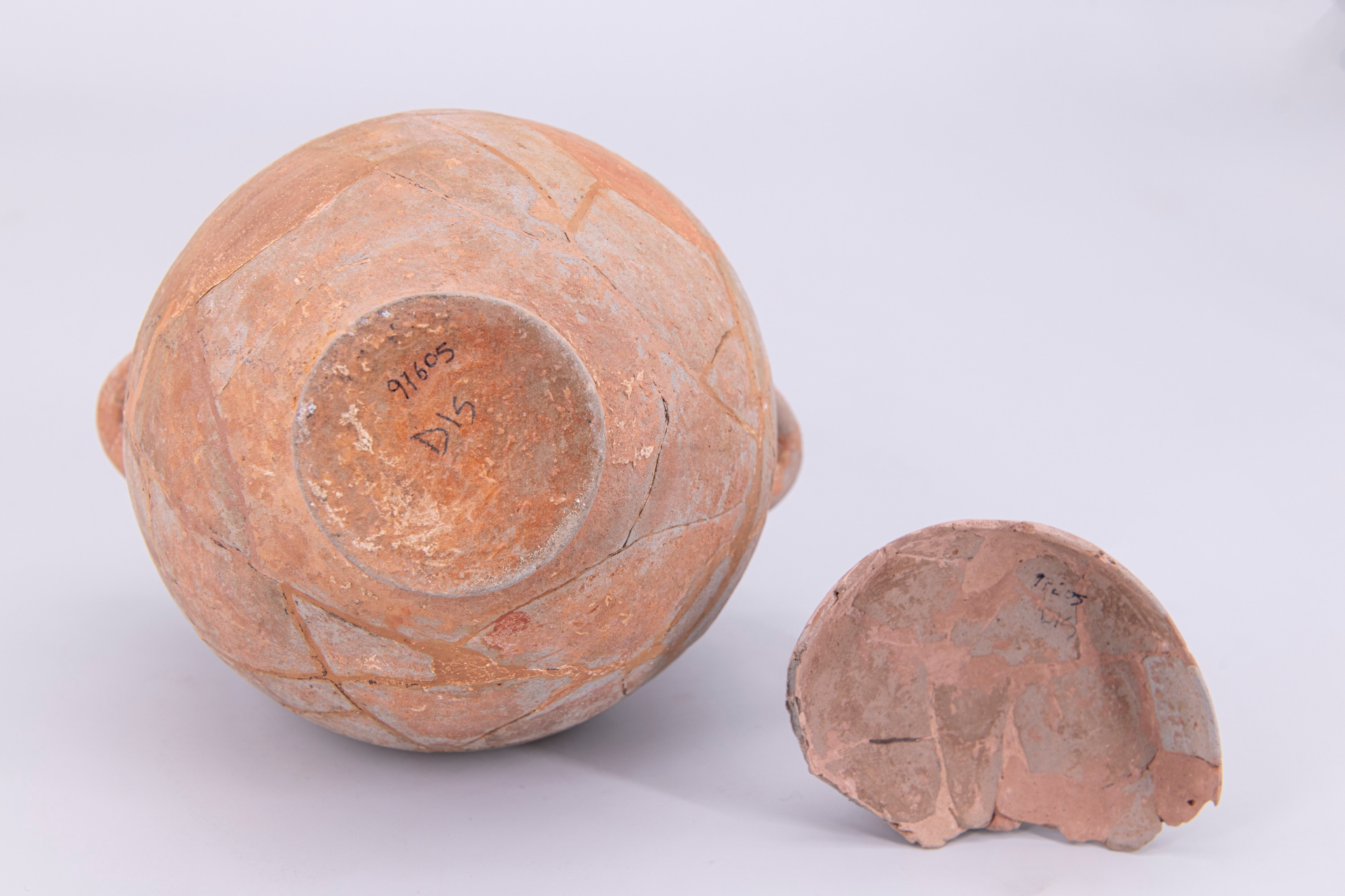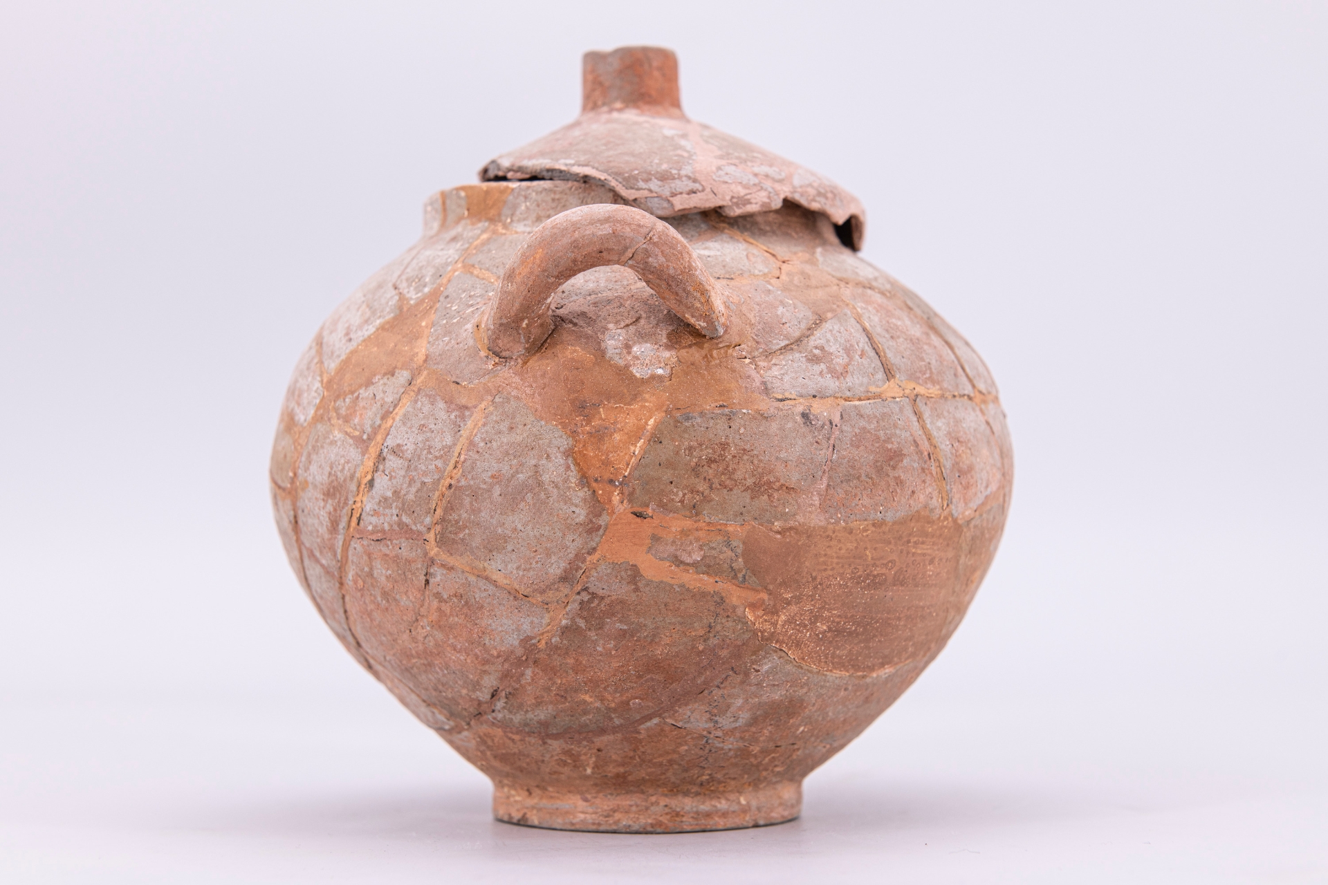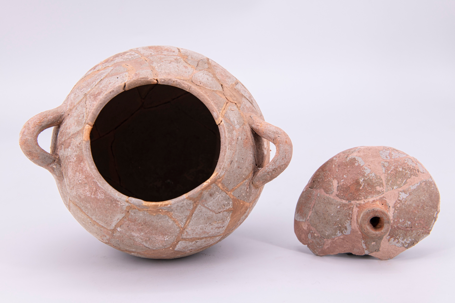 stamnos con coperchio a presa cilindrica, corpo globulare, piede e collo espansi con anse a orecchio
