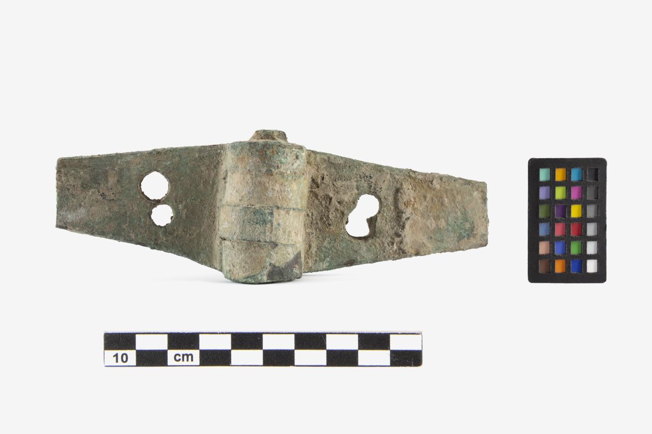 Cardine a forma di placca trapezoidale a margine interno ripiegato ad L, cerniera a quattro larghi anelli cilindrici che conservano ancora tracce del tubolare in ferro. Le placche hanno tre lati profilati e due larghi fori per chiodi di innesto