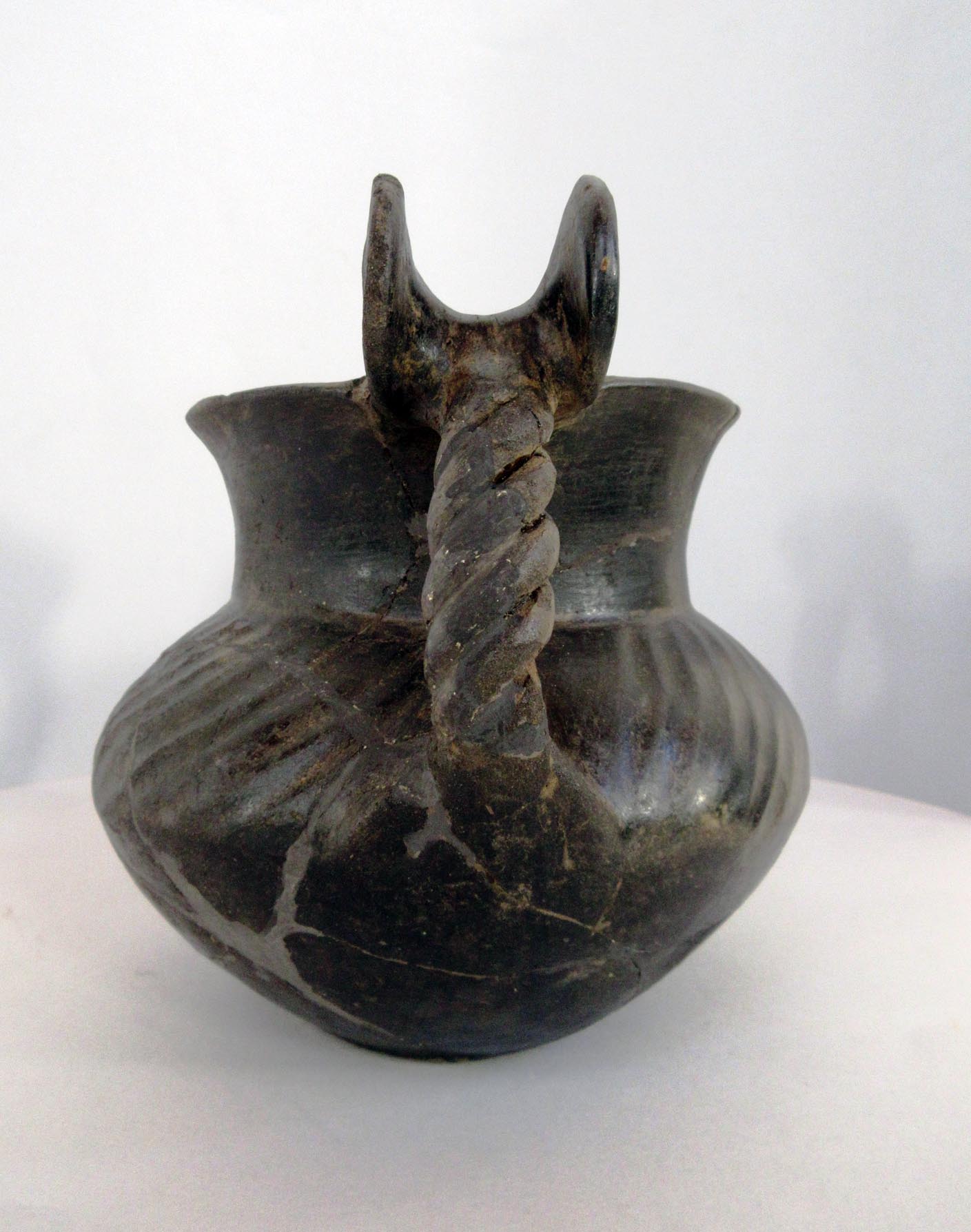 Anfora in impasto bruno nero, piede piano profilato, corpo globulare schiacciato, con spalla arrotondata ornata da fitte costolature epidermiche oblique; largo collo cilindrico che si prolunga senza soluzione di continuità in un labbro svasato terminante nell’orlo assottigliato; anse a tortiglione impostate sulla spalla e sul labbro, ornate, superiormente, da coppia di rotelle