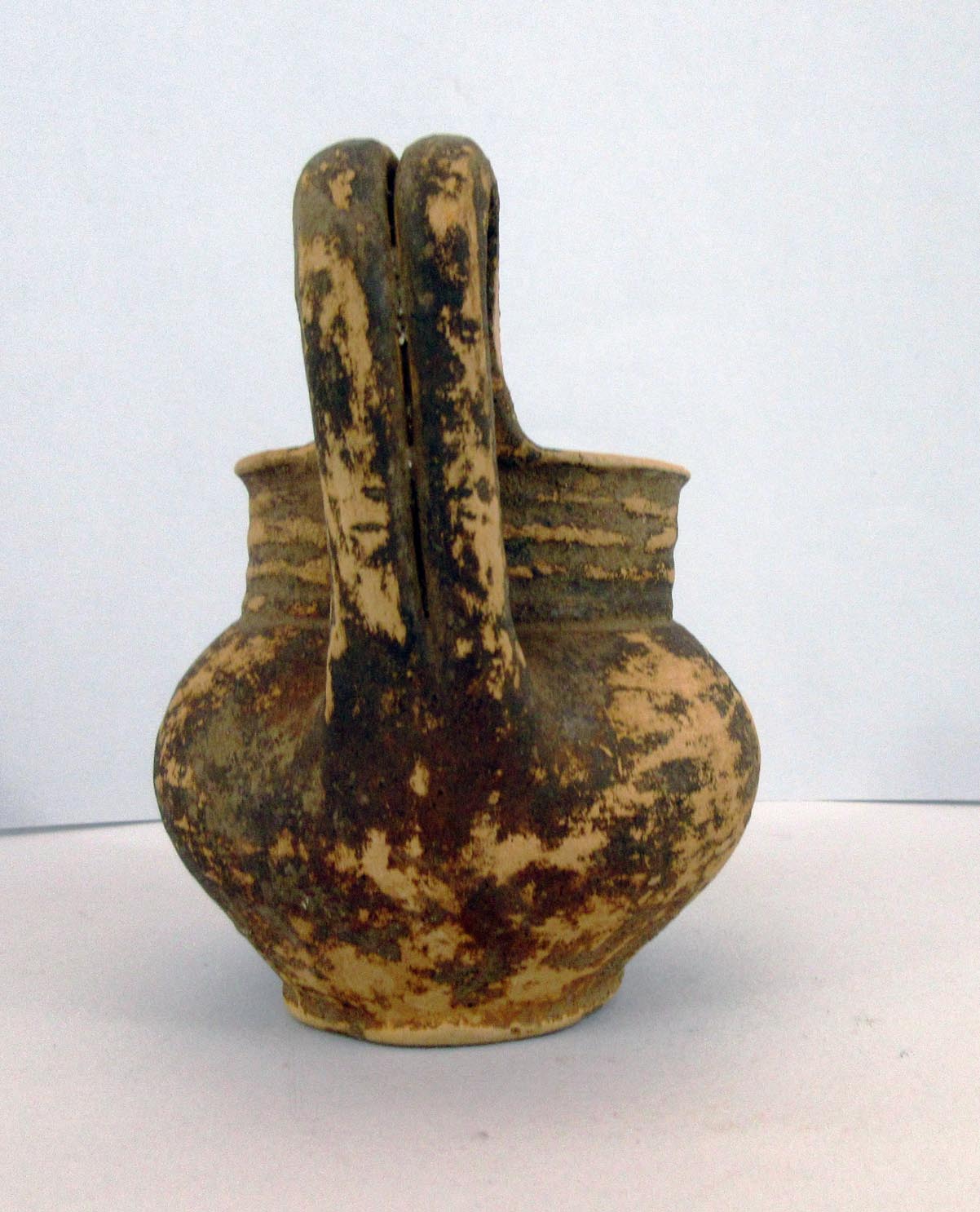 Attingitoio in argilla beige abbastanza depurata con piccoli inclusi neri, vernice nera; piede a disco, corpo globulare, dalla spalla arrotondata si eleva un largo collo cilindrico ornato da costolature orizzontali terminante in un corto labbro svasato. Ansa a doppio bastoncello, sormontante impostata verticalmente tra labbro e spalla, con stretta curvatura a gomito arrotondata. Traccia di elemento angolare a rilievo sulla spalla nel punto opposto all’ansa. Il recipiente è interamente verniciato