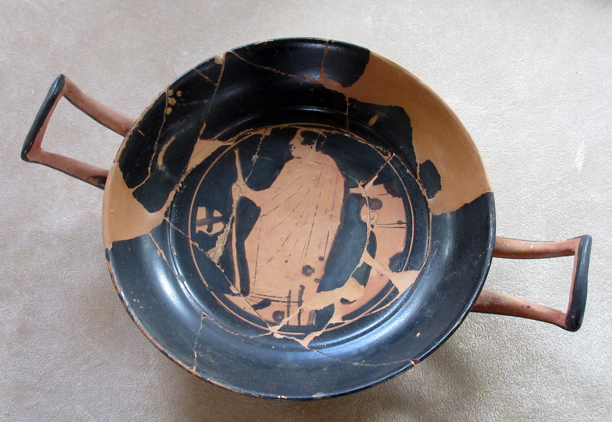Kylix in argilla depurata rosata, vernice nera, vernice bianca. Piede ad anello modanato, distinto, bassa vasca a calotta, labbro assottigliato. Anse orizzontali, impostate a circa metà della vasca, ripiegate verso l’alto con presa a manico a sezione circolare. Il recipiente è decorato secondo la tecnica a figure rosse con elementi sovradipinti in bianco