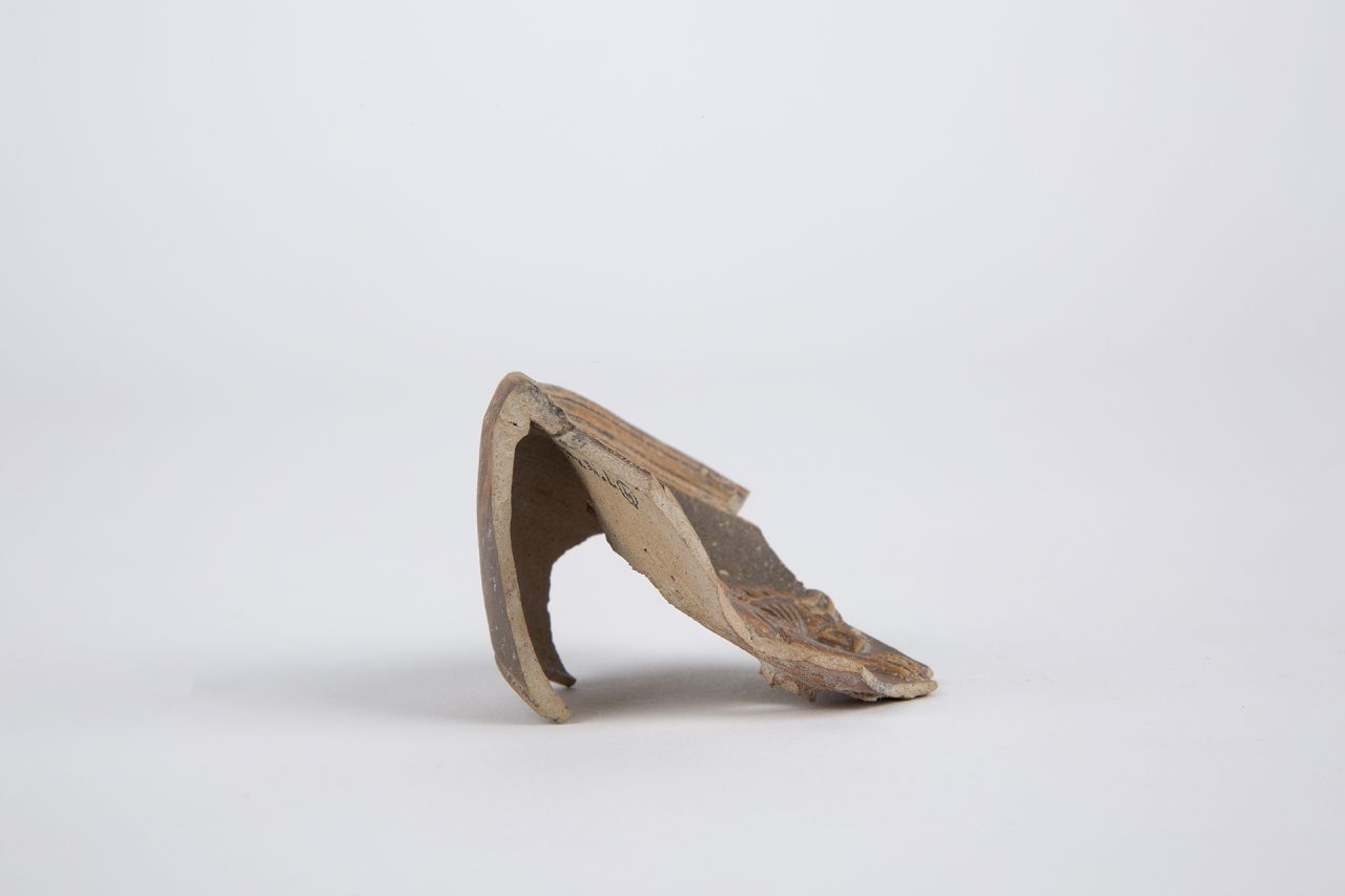 Lucerna a volute, dal becco verosimilmente a terminazione triangolare, con spalla ristretta, arrotondata e piana. Scanalature multiple la separano dal disco, rotondo, depresso e figurato. Il foro di alimentazione è decentrato verso il basso per non interferire con la figurazione. Fondo piano definito da doppia solcatura. Corpo ceramico di colore nocciola, vernice rosso-bruna