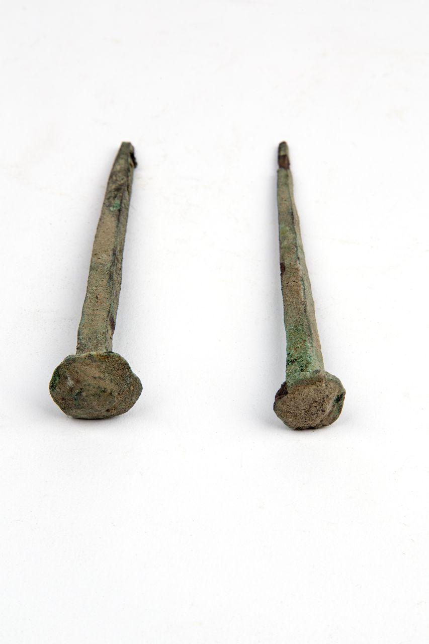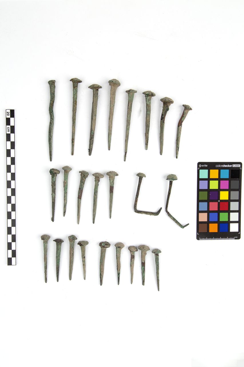 N. 24 chiodi in bronzo, così suddivisi: A) diciotto chiodi con testa a sezione circolare a superficie convessa e gambo a sezione quadrata rastremato verso la punta; B) tre chiodi con testa a sezione circolare o sub-circolare a superficie piana e gambo a sezione quadrata rastremato verso la punta; C) due chiodi con testa di forma emisferica e il gambo sottile a sezione quadrata; D) un chiodo privo della testa, con gambo a sezione quadrata rastremato verso la punta
