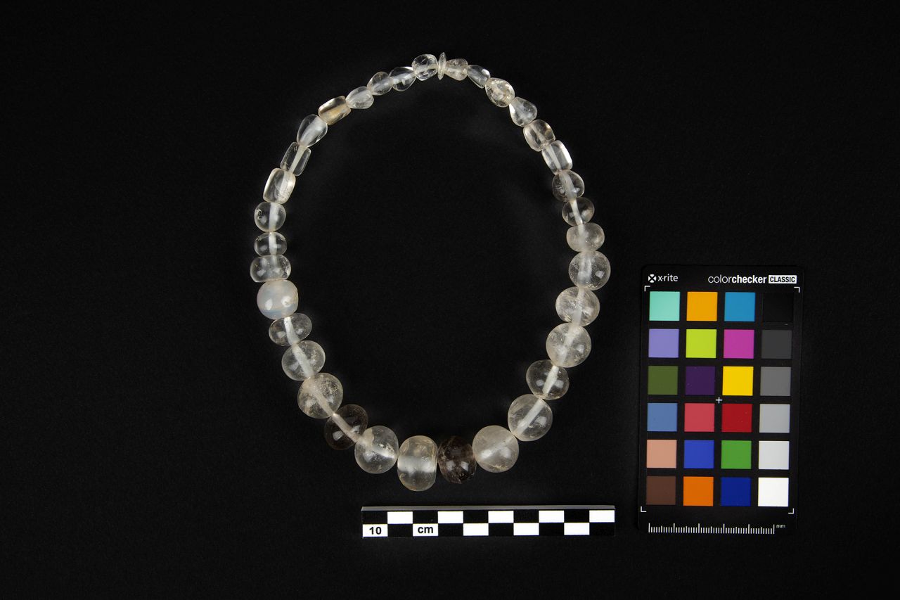 N. 35 vaghi di collana di cristallo di rocca (quarzo macrocristallino). Venti vaghi sono di medie e grandi dimensioni, dalla forma sferica più o meno schiacciata, con foro passante (A), cinque di medie dimensioni, di forma parallelepipeda a sezione quadrata con foro passante (B), nove di piccola-media dimensione, di forma troncoconica a superficie convessa con foro passante (C) ed infine un vago sottile, di forma lenticolare con foro passante (D).Colore trasparente, ad eccezione di due vaghi (A), di colore grigio-bruno, superficie lucidata