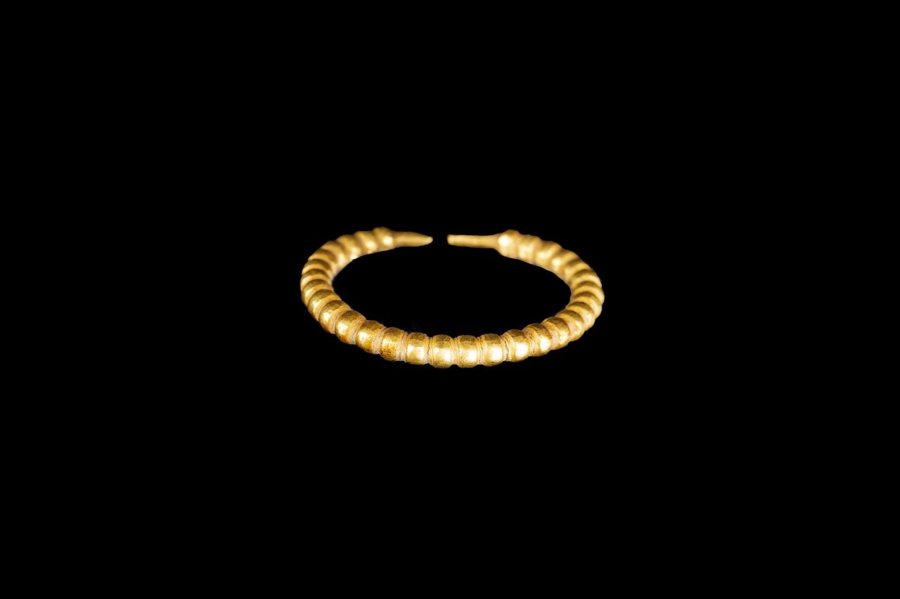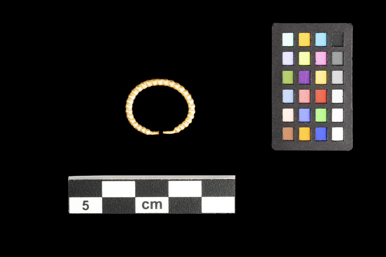 Anello con verga d'oro massiccio godronato con le estremità tubolari sottili. La godronatura della verga definisce trenta piccoli grani di forma pressochè sferoidale. Le estremità affusolate erano atte a permettere ad una gemma o ad una perla con foro passante di esservi fissata