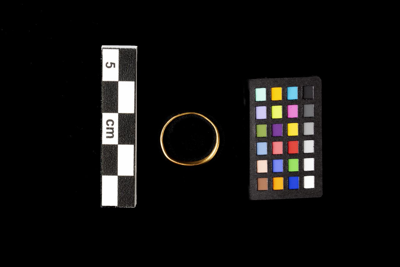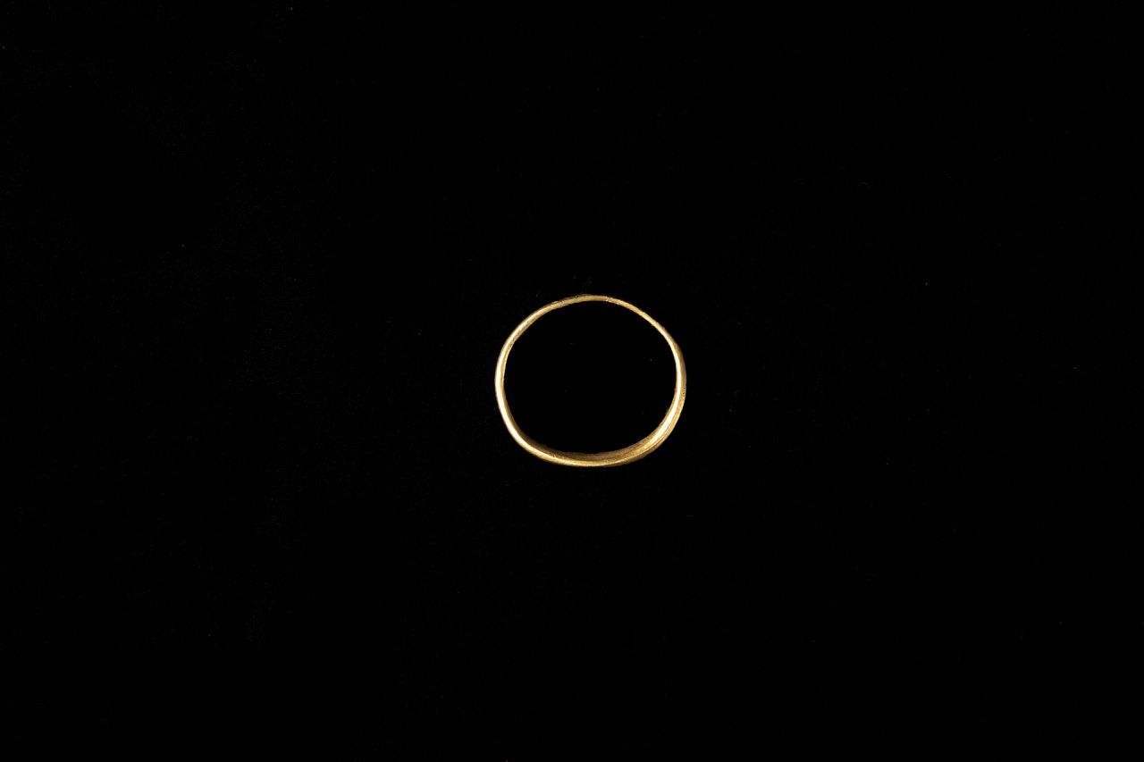 Anello con verga piena a sezione circolare e castone ovoidale piatto, sul quale è inciso un motivo vegetale