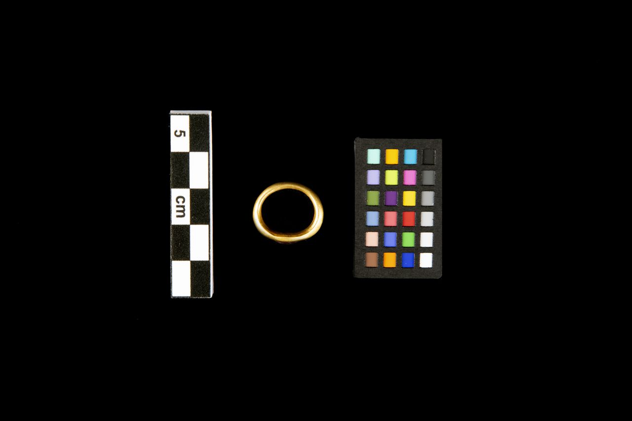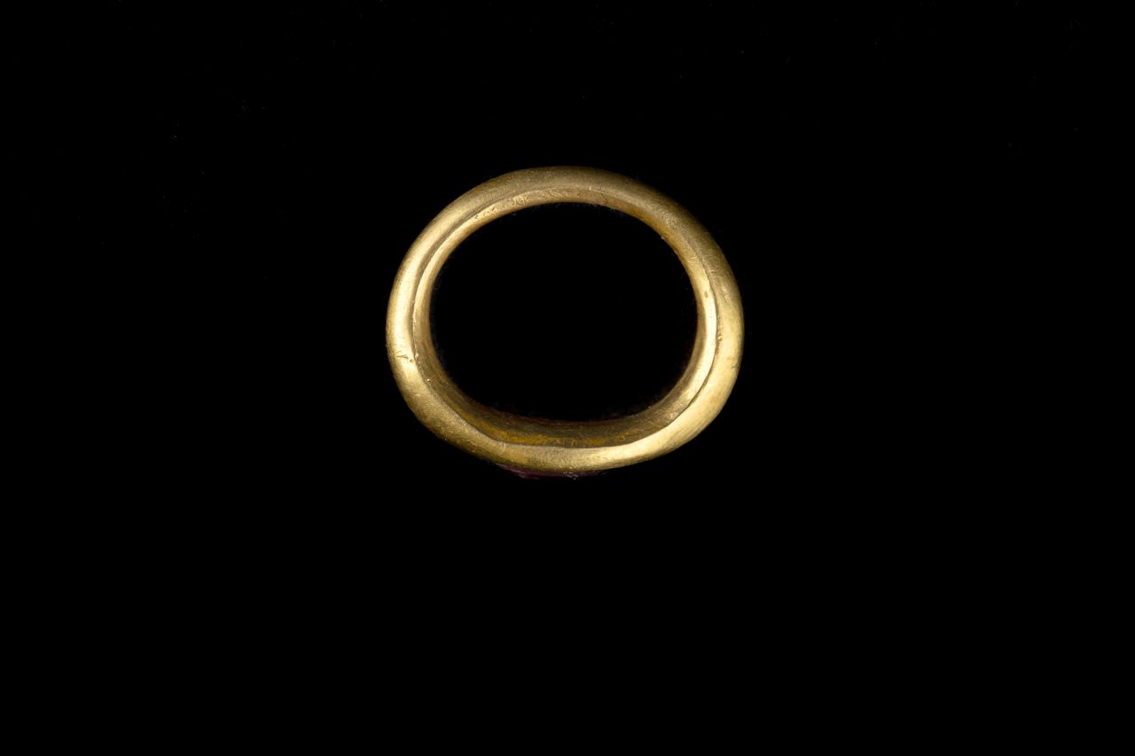 Anello con verga piena a sezione circolare che si allarga a formare un castone ovale, nel quale è inserita una gemma dalla superficie convessa