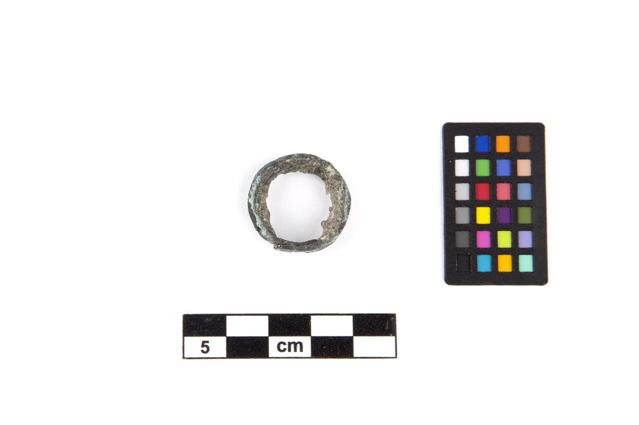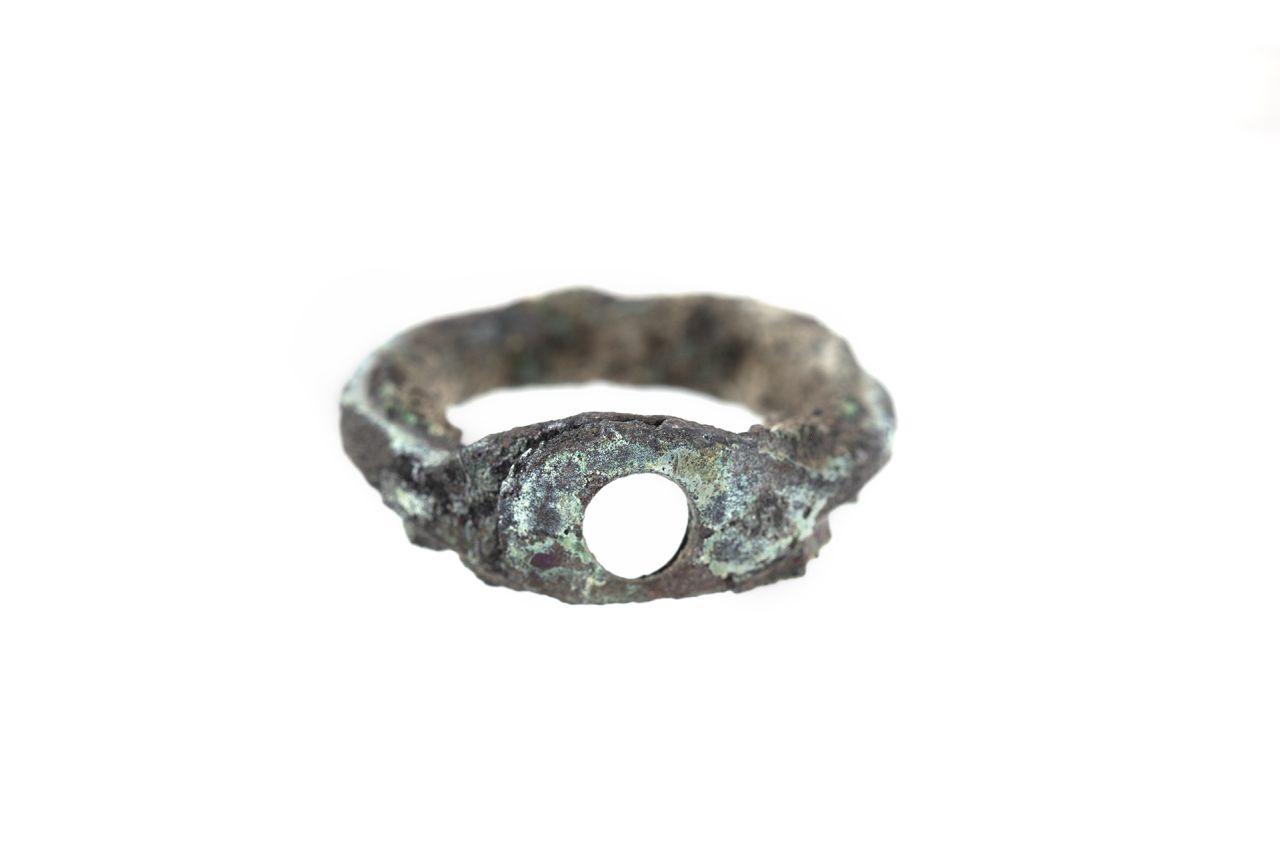 Anello a verga con sezione circolare che si allarga in un castone ovale, in corrispondenza del quale presenta un foro circolare in posizione centrale, per l'alloggiamento forse di una gemma
