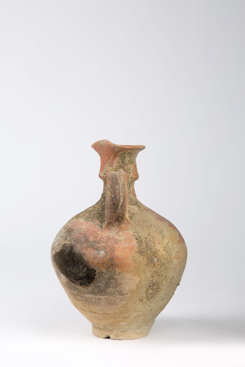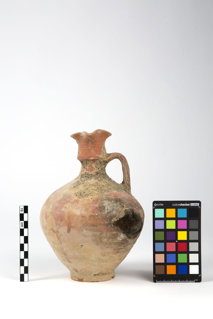 Piccola bocca a becco con ampia base, breve collo cilindrico, corpo globulare a fondo rastremato, piede ad anello. Ansa verticale a nastro, scanalata, impostata a meta del collo e sulla spalla